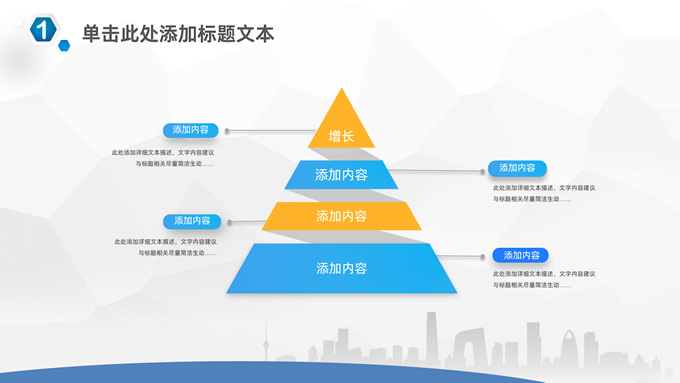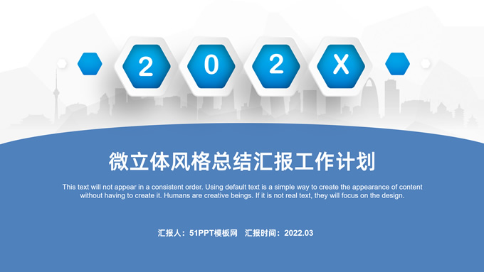 简介:微立体几何风简约商务总结汇报通用ppt模板,本模板共22P,淡雅灰低三角形背景,城市剪影、弧度几何、六边形微立体元素创意封面、目录页、过渡页,蓝黄配色,微立体风格图表简约商务版式内容页,适合工作总结、工作汇报等场景应用的微立体商务通用ppt模板。