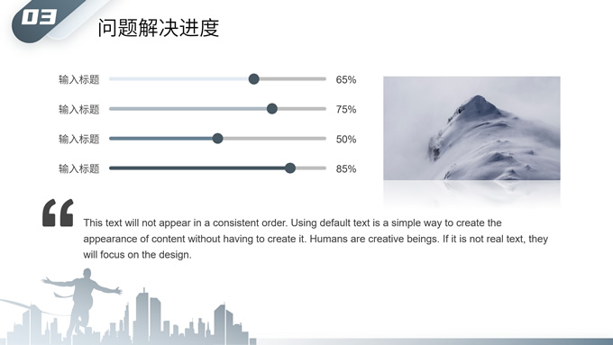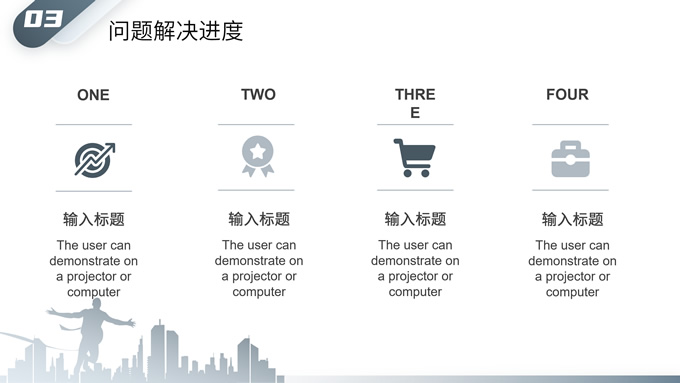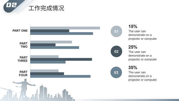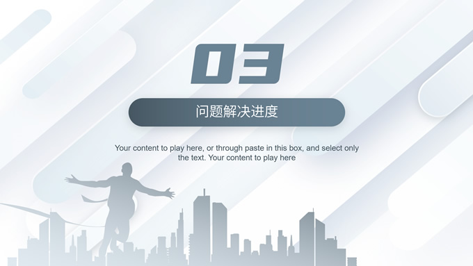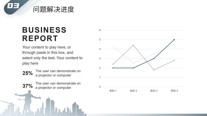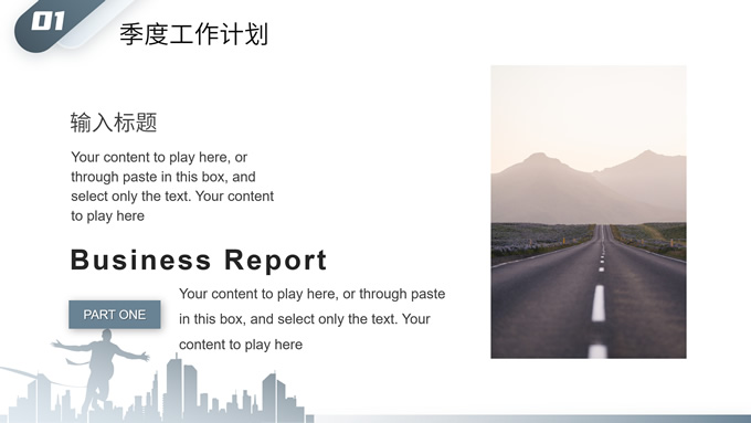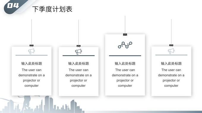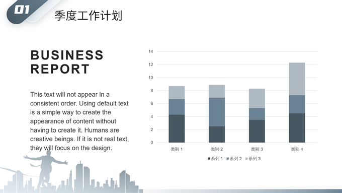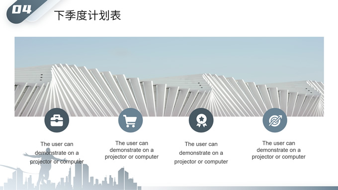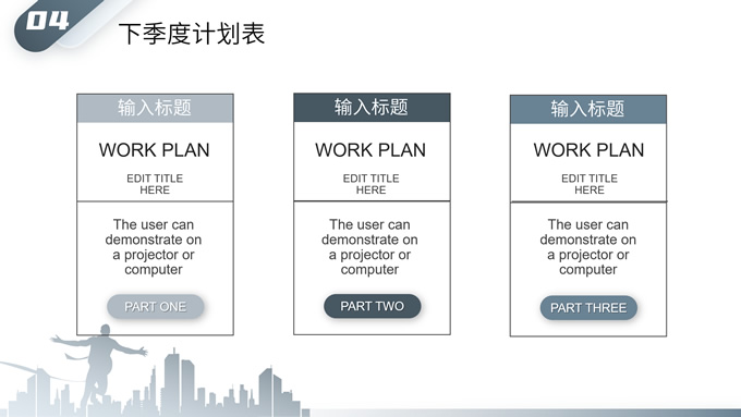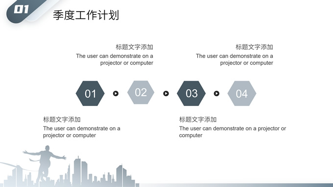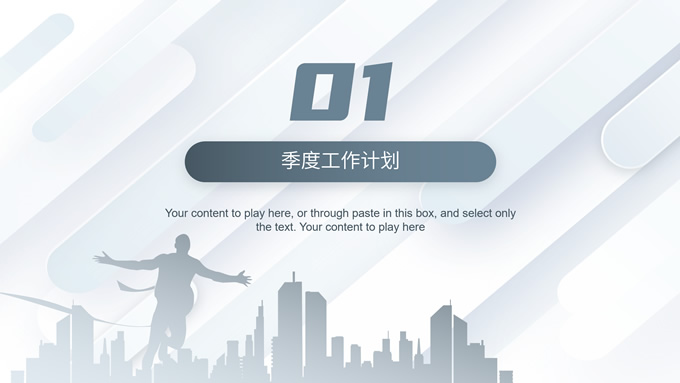 简介:层次感圆角矩形几何风季度工作计划汇报ppt模板,本模板共23P,目录:季度工作计划、工作完成情况、问题解决进度、下季度计划表,层次感渐变圆角矩形背景,冲线人物城市剪影圆角矩形几何风极简封面、目录页、过渡页,经典灰配色,扁平化图表,极简约商务风版式内容页,适合季度工作计划、企业汇报、商务汇报等场景应用的几何风商务通用ppt模板。
