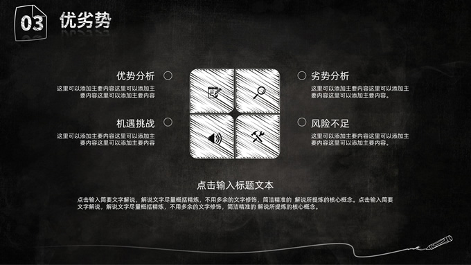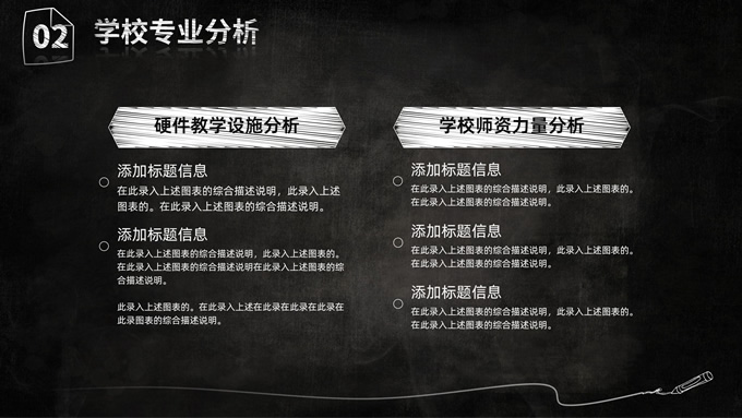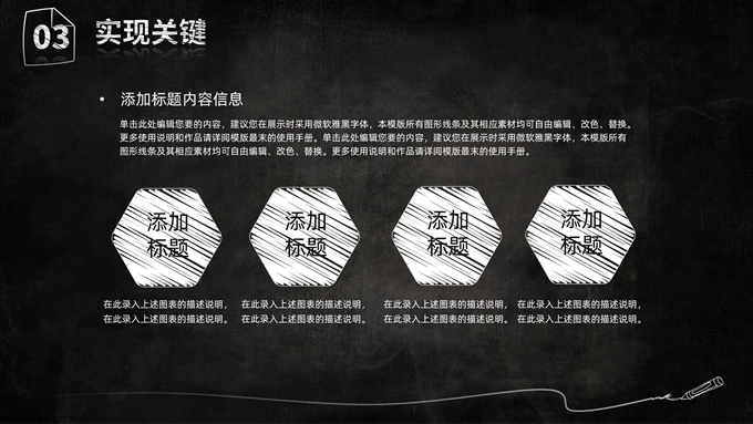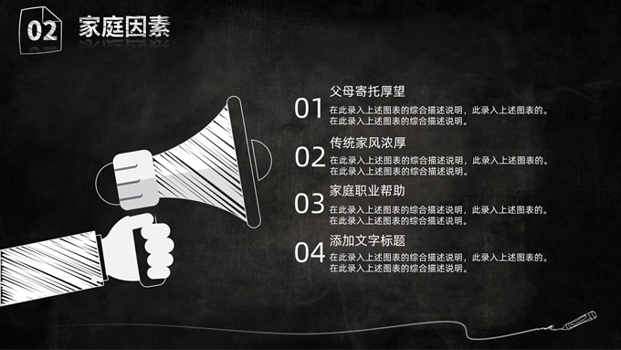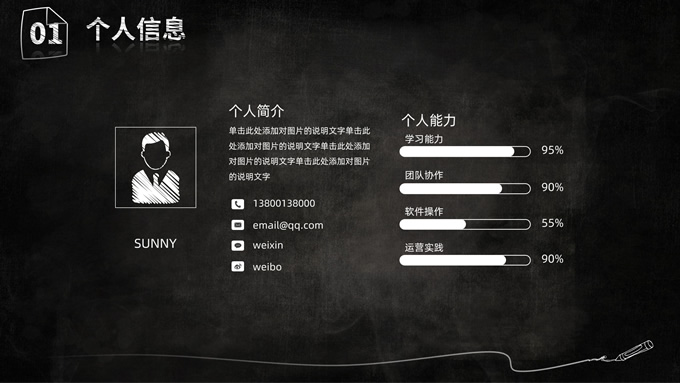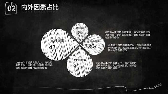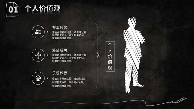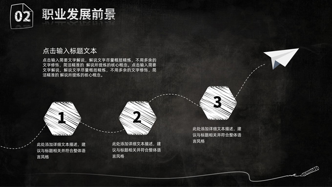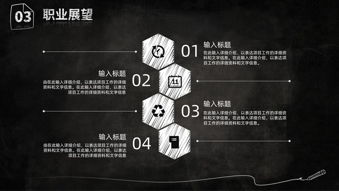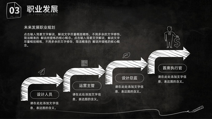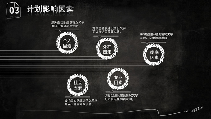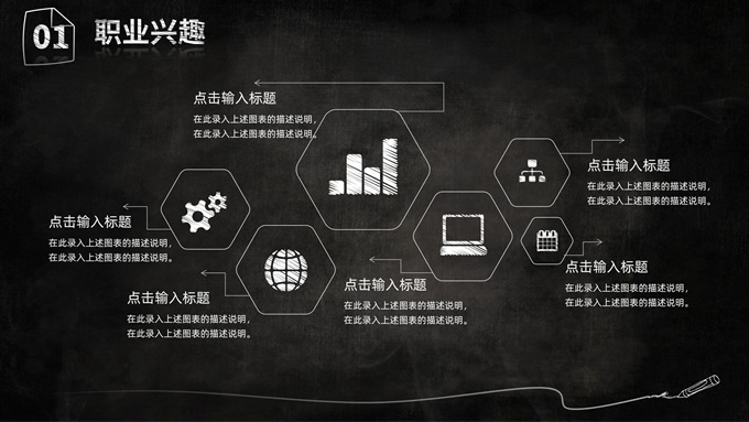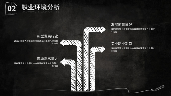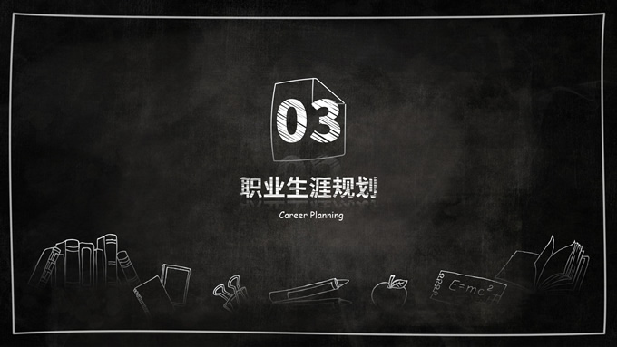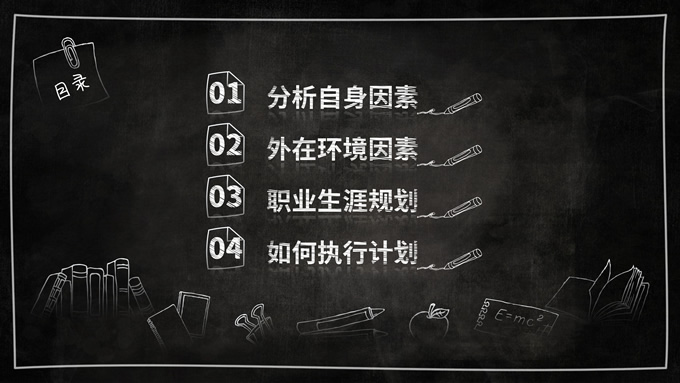 简介:粉笔手绘风大学生职业生涯规划ppt模板,本模板共30P,目录:分析自身因素、外在环境因素、职业生涯规划、如何执行计划,黑板背景,粉笔手绘图标、粉笔字体创意封面、目录页、过渡页,粉笔手绘风图表完整框架版式内容页,适合职业生涯规划、毕业汇报、论文答辩等场景应用的大学生通用型ppt模板。