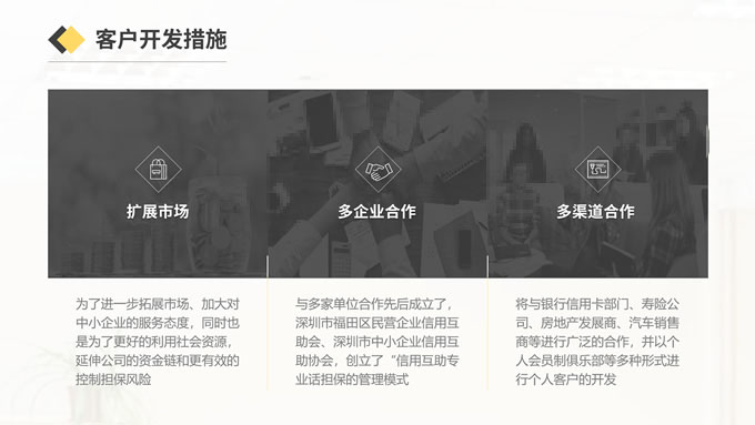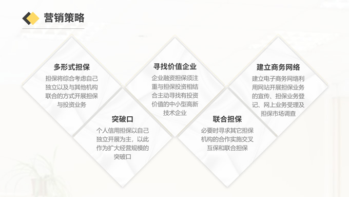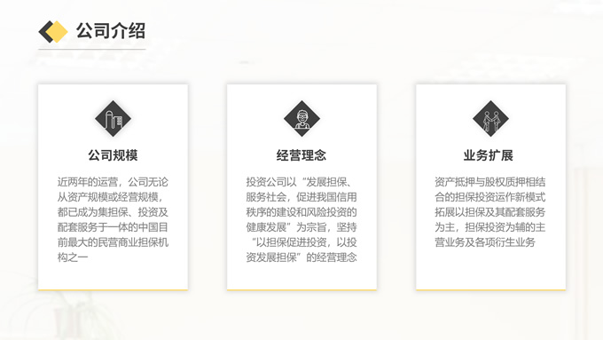 简介:黑金投资担保商业计划书ppt模板,适用于投资担保行业,本模版共13P,内含完整的PPT模版结构(封面页、目录页、过渡页、内容页、封底页、其中涵盖图表页)简约大气,更是有具体的内容,让我们在工作中省时省力,提高效率,P界达人 吥忘初心 作品。
