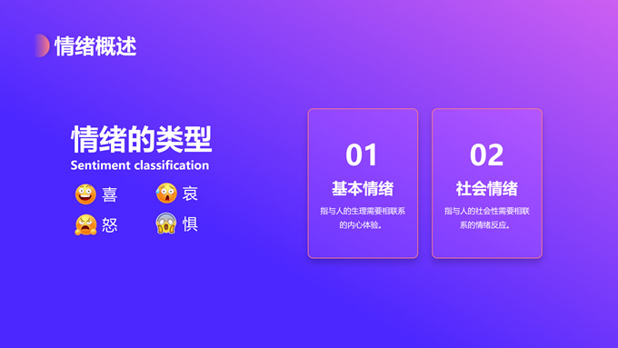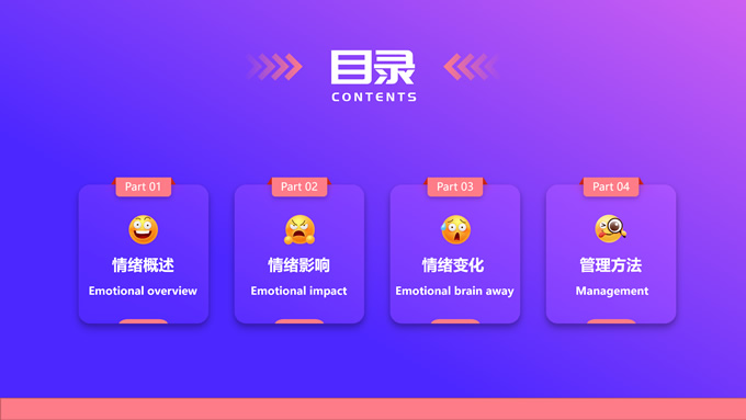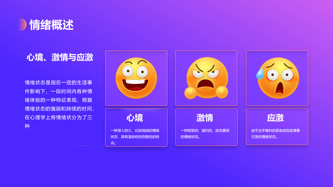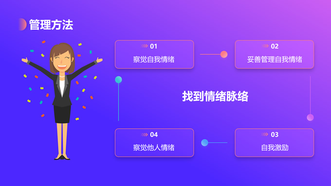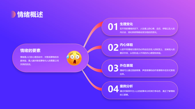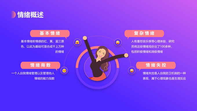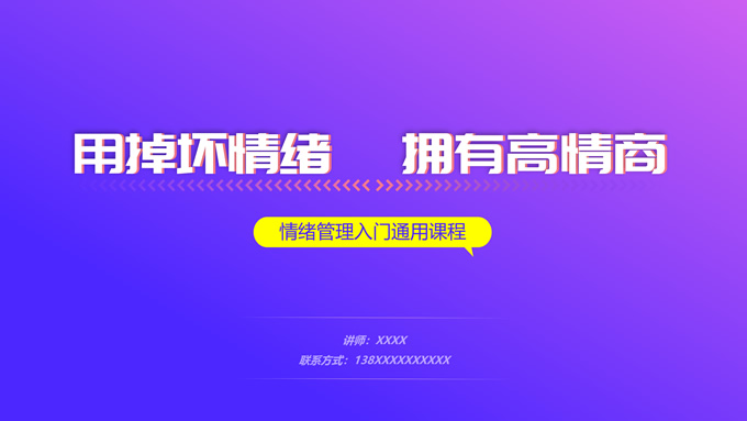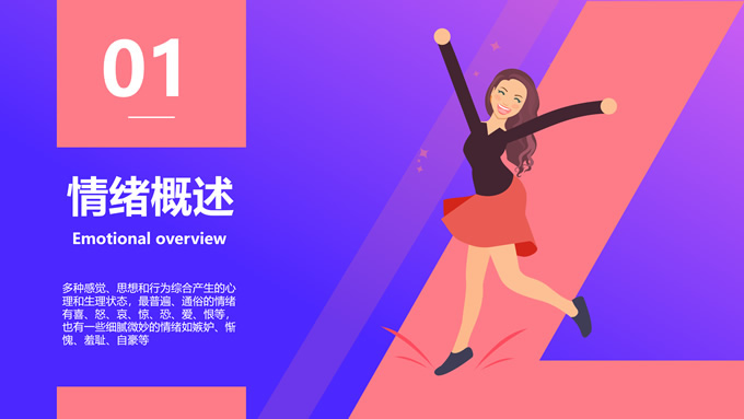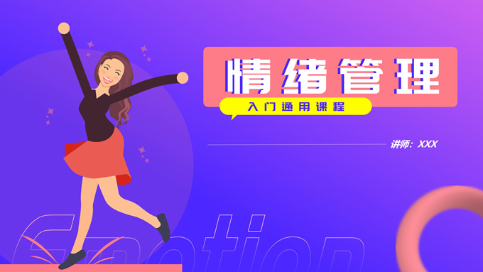 简介:蓝紫渐变插画风情绪管理培训ppt模板,本模板共12P,目录:情绪概述、情绪影响、情绪变化、管理方法,蓝紫渐变配色,简约设计,支持一键换色,包括封面页、目录页、过渡页、内容页等整体框架,适用于职业培训、工作总结等场景应用,P界达人 花生壳 作品。