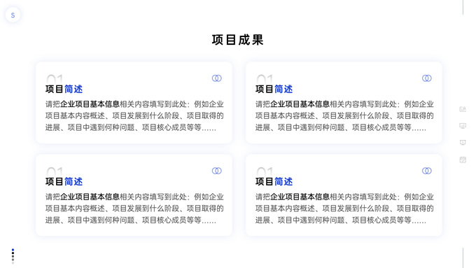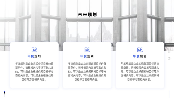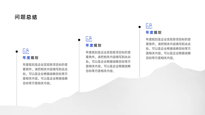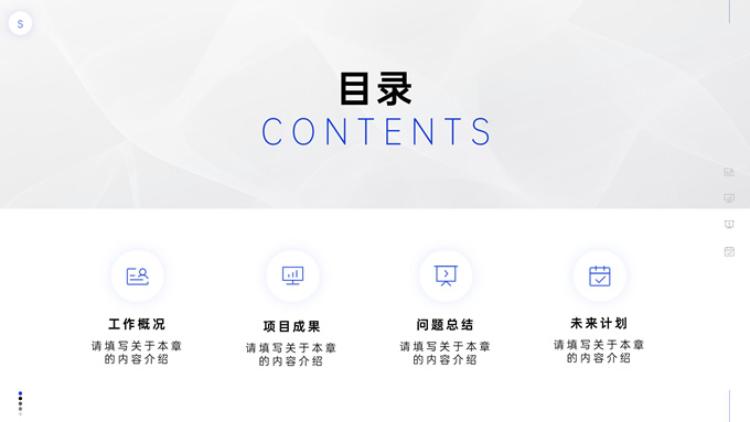 简介:蓝灰高端简约总结计划商务通用ppt模板,本模板共11P,目录:工作概括、项目成果、问题总结、未来计划,淡雅灰背景,极简标题文字创意封面、目录页、过渡页,蓝灰配色,简约清新版式内容页,适合工作总结、工作汇报、工作计划等场景应用的商务通用ppt模板,P界达人 于香芋 作品。