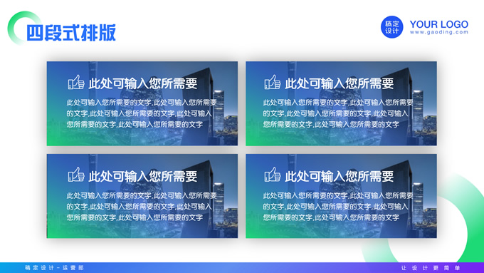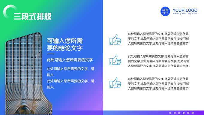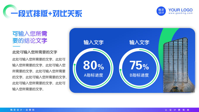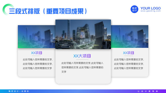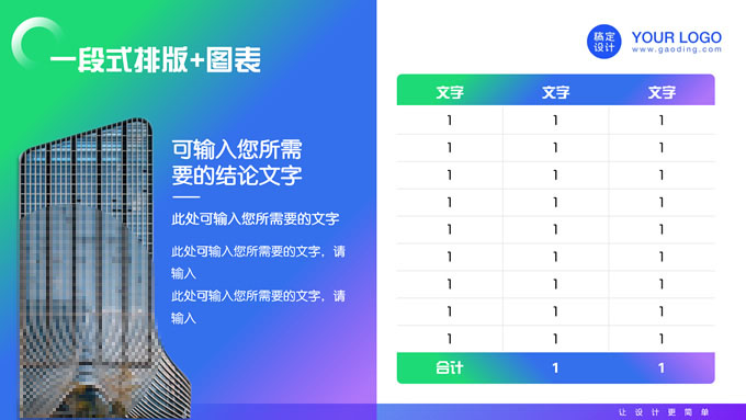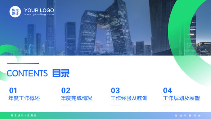 简介:蓝绿紫时尚几何风年度总结汇报ppt模板,本模板共20P,目录:年度工作概述、年度完成情况、工作经验及教训、工作规划及展望,商务图片时尚几何元素创意封面、目录页、过渡页,蓝绿紫配色,阴影风格图表,适合年终总结、年度汇报等场景应用的时尚几何风商务通用ppt模板,稿定年终PPT模板大赛 陈彦君 作品。