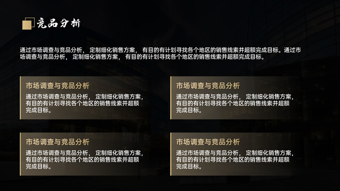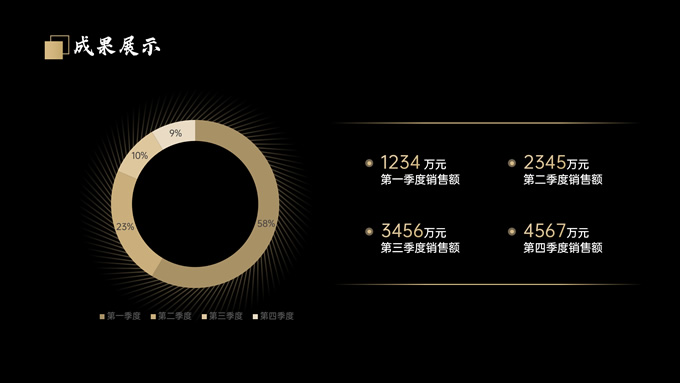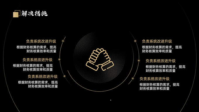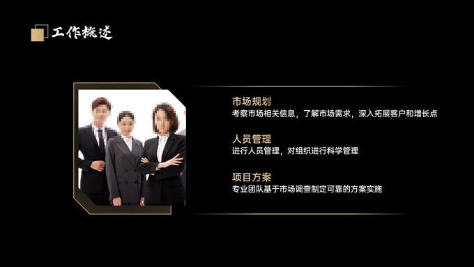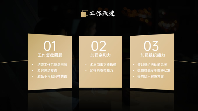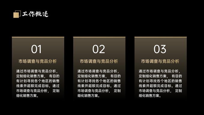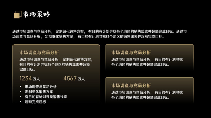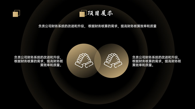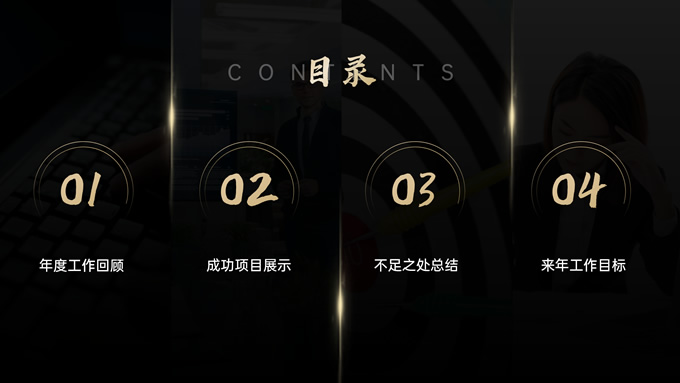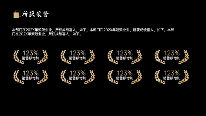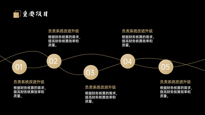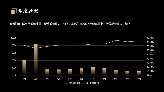 简介:商务通用时尚大气黑金年度总结ppt模板,本模板共21P,可用于年底公司/部门内外的绩效总结展示,模板包含矢量曲线为点缀的金色大气书法字体的封面页,图文并茂的目录页,大理石质感的过渡页以及丰富的内容页(数据图标页、表格页、团队人物页,图文页等),可替换自由创造,P界达人 立羽 作品。