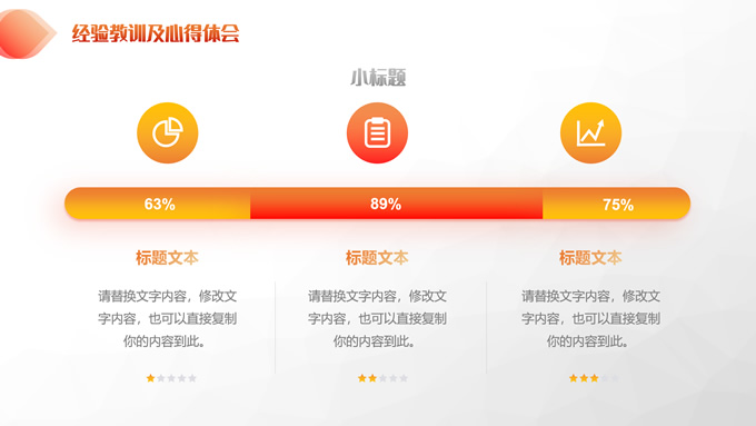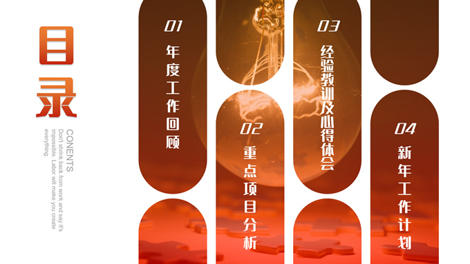 简介:热情橙个人年度工作总结报告ppt模板,本模板共23P,目录:年度工作回顾、重点项目分析、经验教训及心得体会、新年工作计划,商务大楼大图背景,半透明几何风封面、目录页、过渡页,热情橙配色,扁平化图表,完整框架简约实用版式内容页,适合个人总结、年度工作汇报等场景应用的商务通用ppt模板,稿定年终PPT模板大赛 Ritalixi 作品。