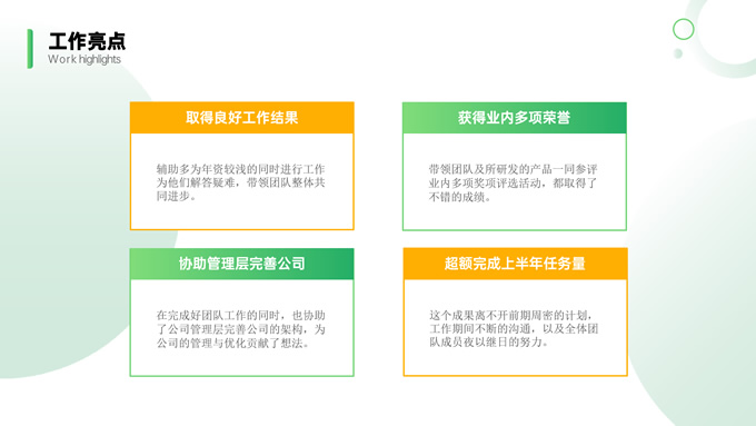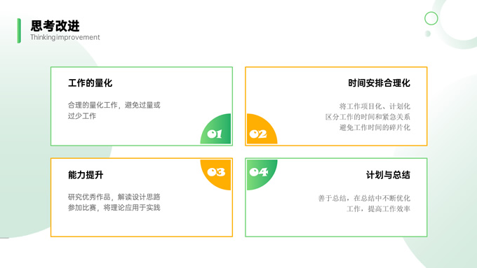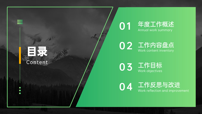 简介:清爽简约黄绿几何风年终工作总结汇报ppt模板,本模板共22P,目录:年度工作概述、工作内容盘点、工作目标、工作反思与改进,几何风创意封面、目录页、过渡页,黄绿清新风配色,扁平化图表,极简约清新风版式内容页,适合年终总结、工作汇报、新年工作计划等场景应用的几何风清新商务通用ppt模板,稿定年终PPT模板大赛 豌豆颠儿 作品。