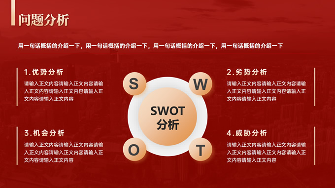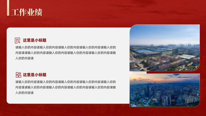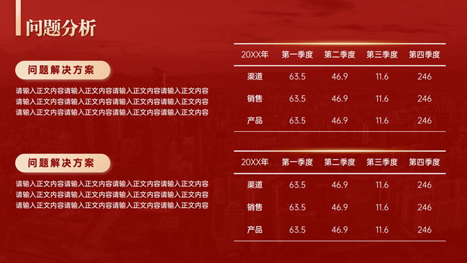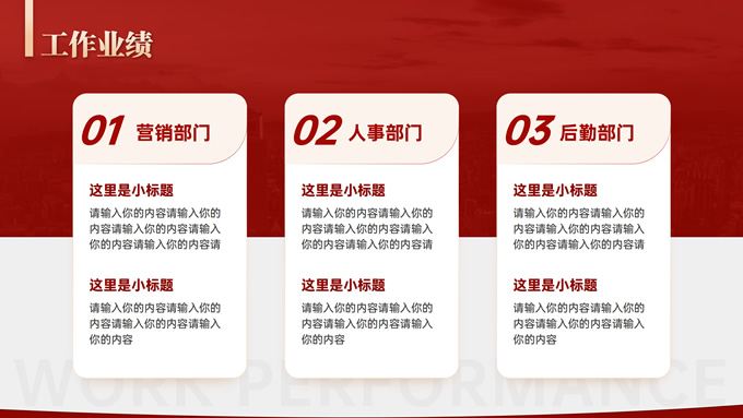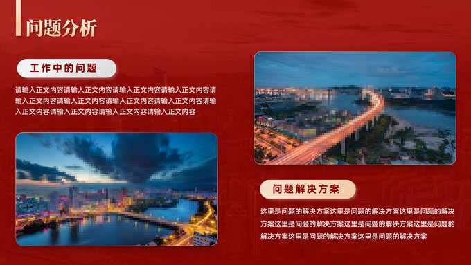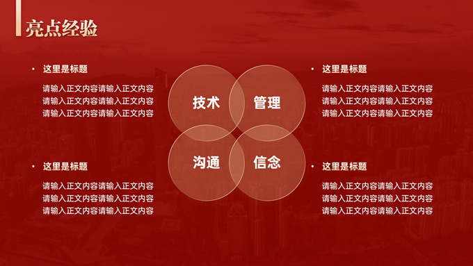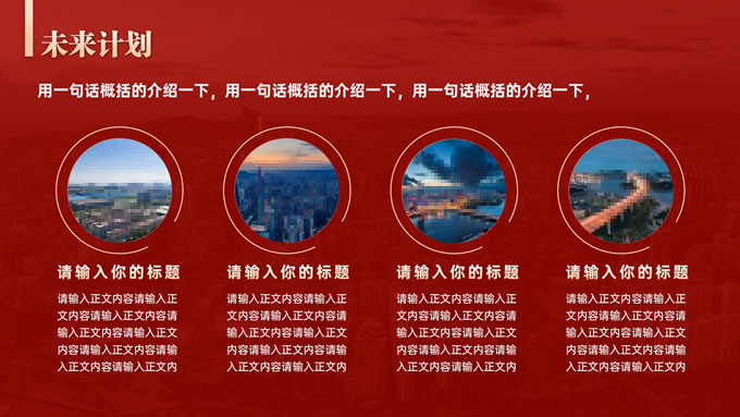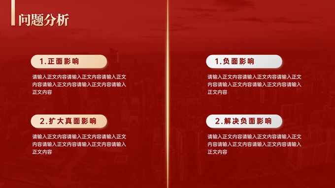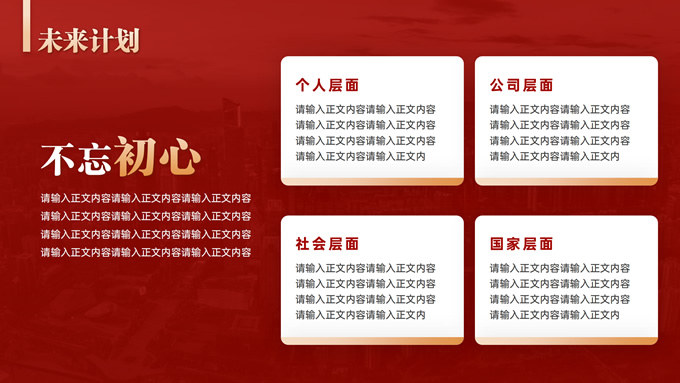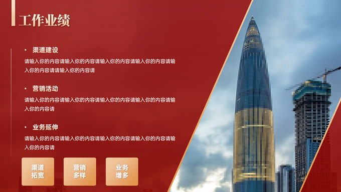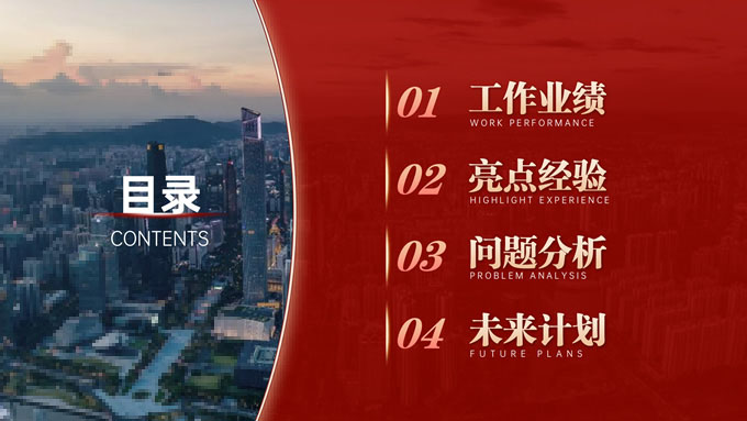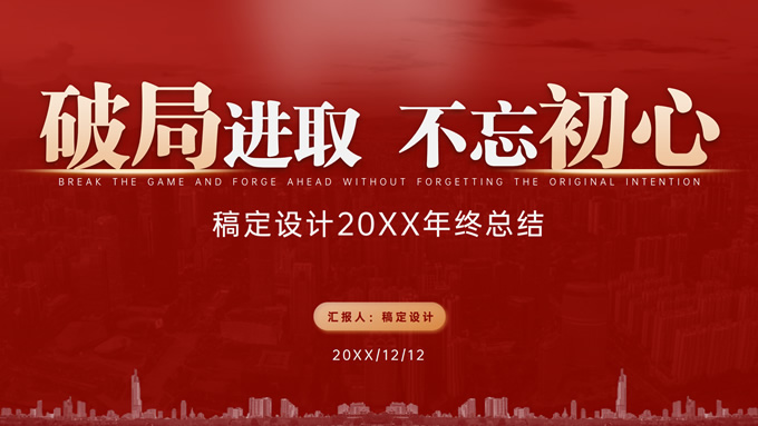 简介:破局进取 不忘初心——喜庆红年终总结ppt模板,本模板共26P,目录:工作业绩、亮点经验、问题分析、未来计划,半透明红商务大楼背景、城市剪影标题文字创意封面、目录页、过渡页,卡片式UI风格图表版式内容页,精美大气设计,适合年终总结、年终汇报等场景应用的商务通用型ppt模板,稿定年终PPT模板大赛 一叶 作品。