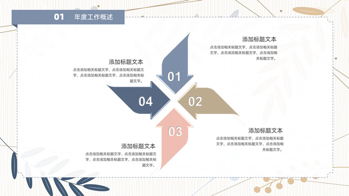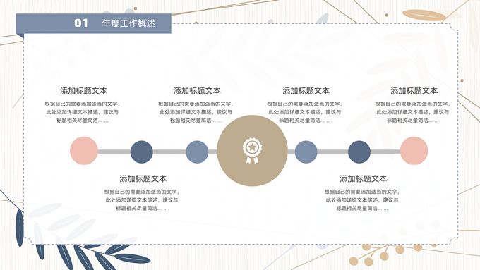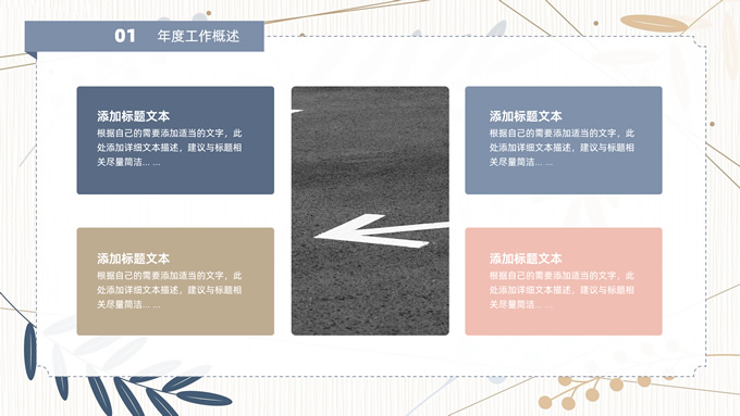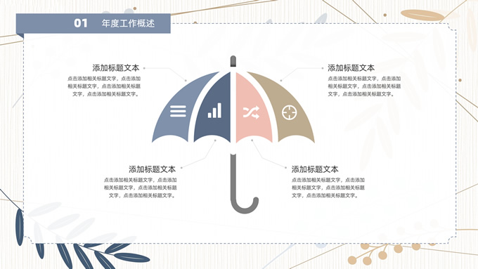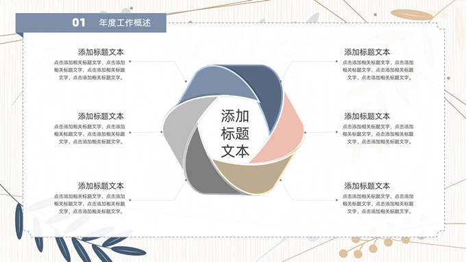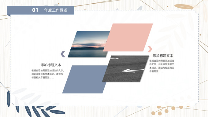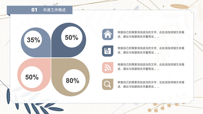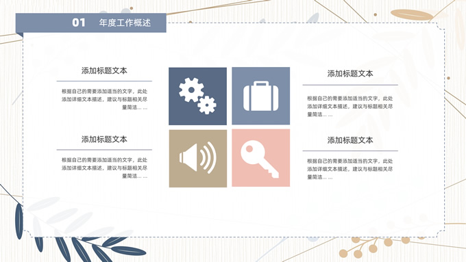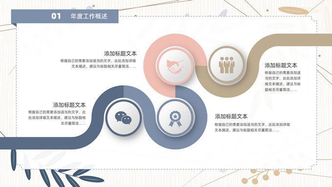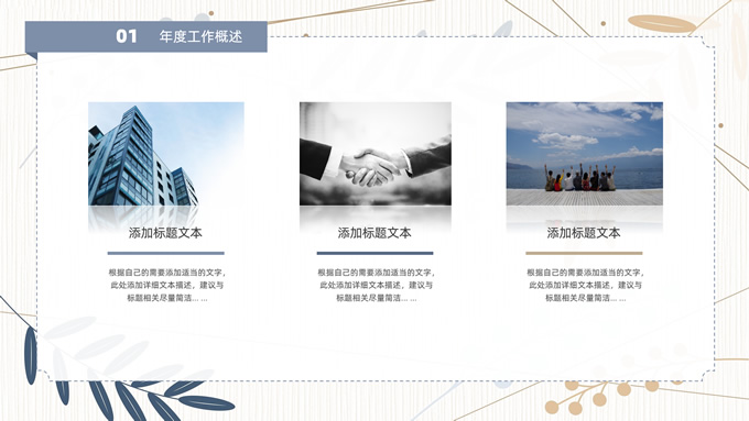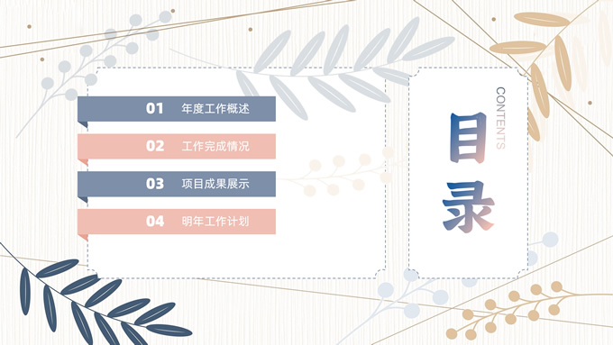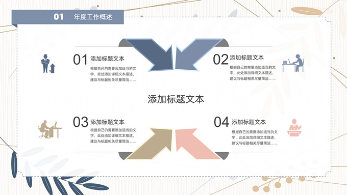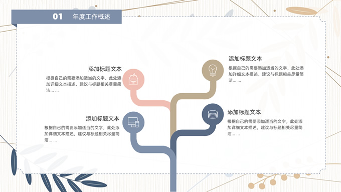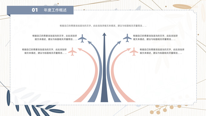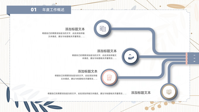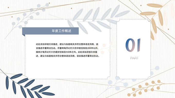 简介:矢量枝叶文艺风述职报告ppt模板,本模板共20P,竖线条纹理矢量枝叶几何线条背景,几何文本框标题文字封面、目录页、过渡页,扁平化图表,经典商务配色,简约实用商务范版式内容页,适合述职报告、工作汇报、年终总结等场景应用的文艺风商务通用ppt模板。