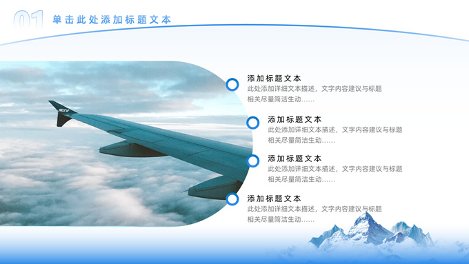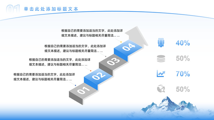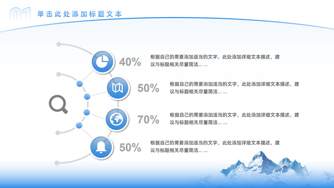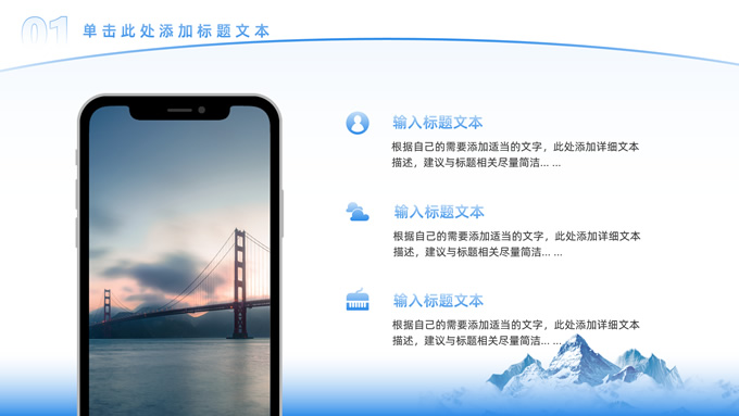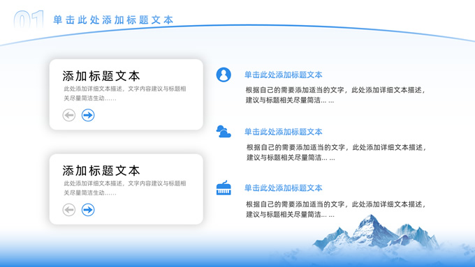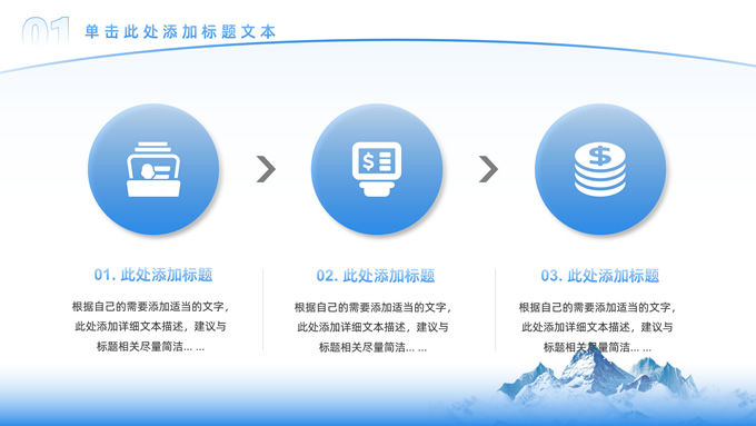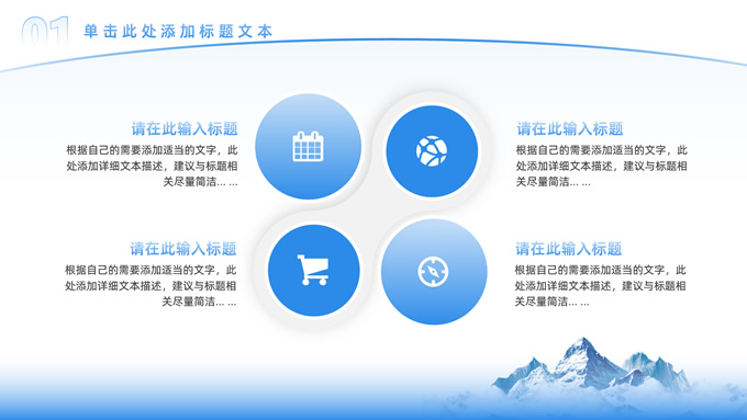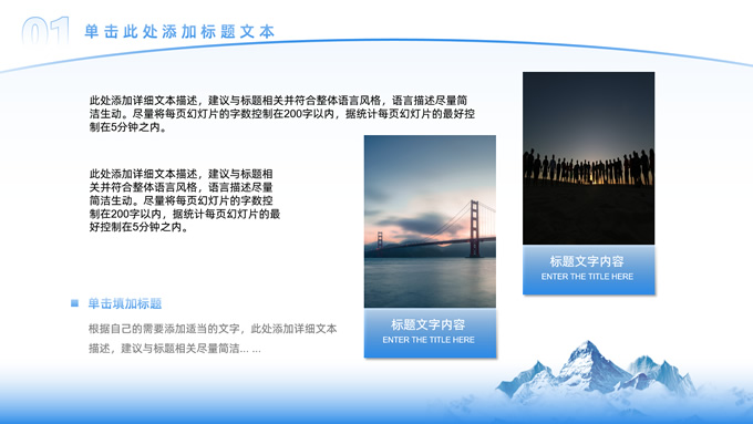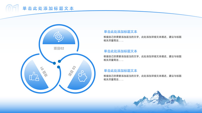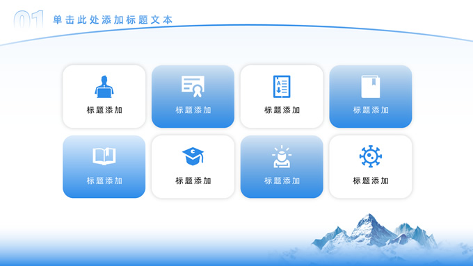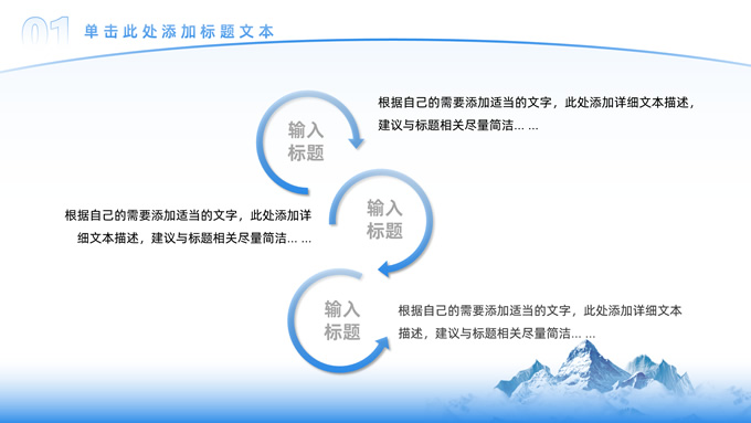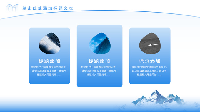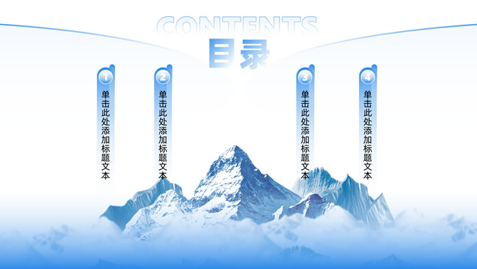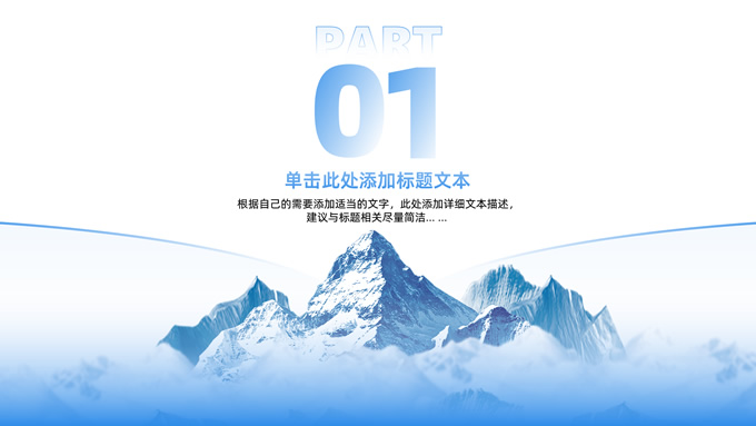 简介:雪山主图经典蓝工作汇报ppt模板,本模板共16P,巍峨雪山主图,渐变大字标题文字创意封面、目录页、过渡页,渐变蓝小清新配色,简约商务范版式内容页,适合工作汇报、年终工作总结、工作计划等场景应用的商务通用ppt模板。