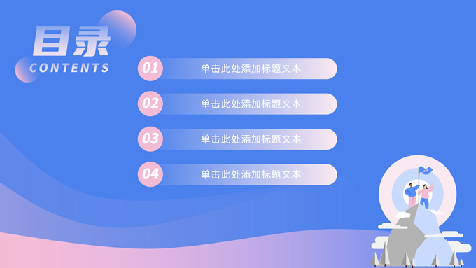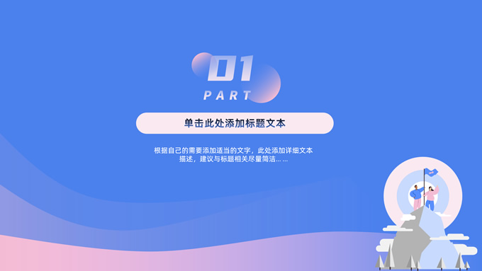 简介:蓝紫卡通活力风工作计划ppt模板,本模板共21P,卡通人物攀登到山顶插上旗子主图渐变几何创意封面、目录页、过渡页,蓝粉清新活力风配色,扁平化图表,适合工作计划、个人工作汇报、个人工作总结等场景应用的总结汇报计划通用型ppt模板。