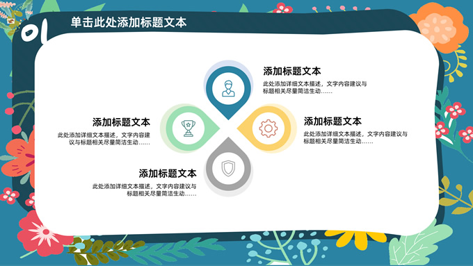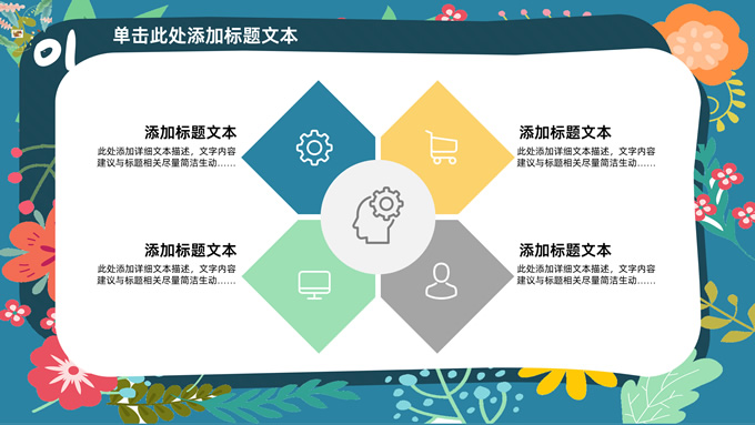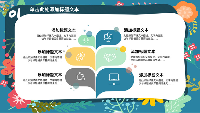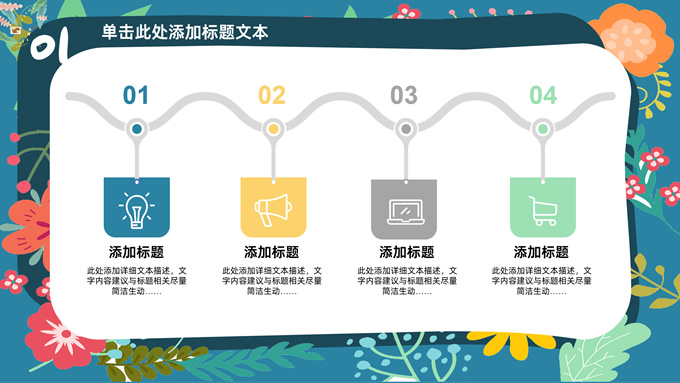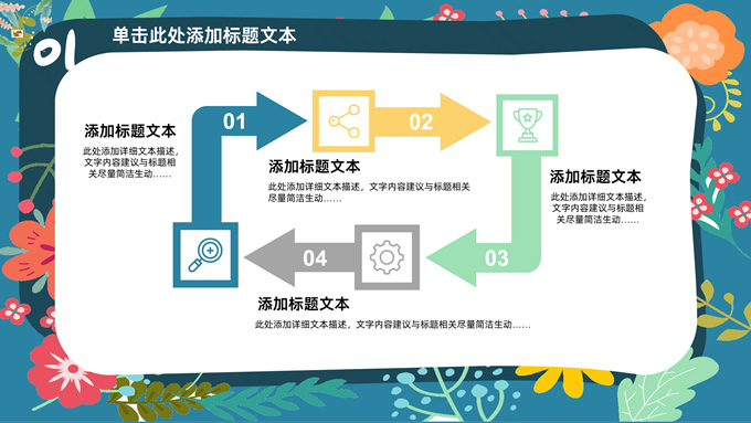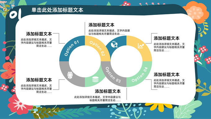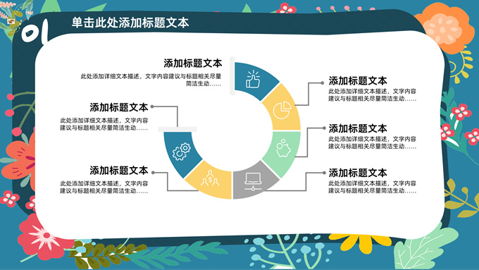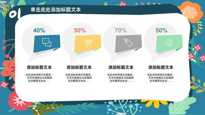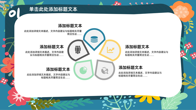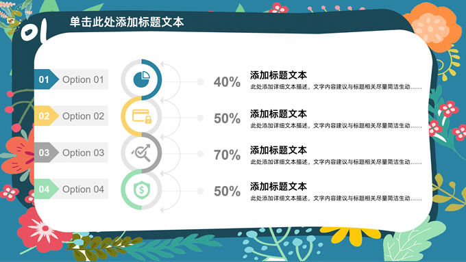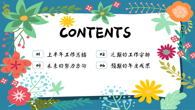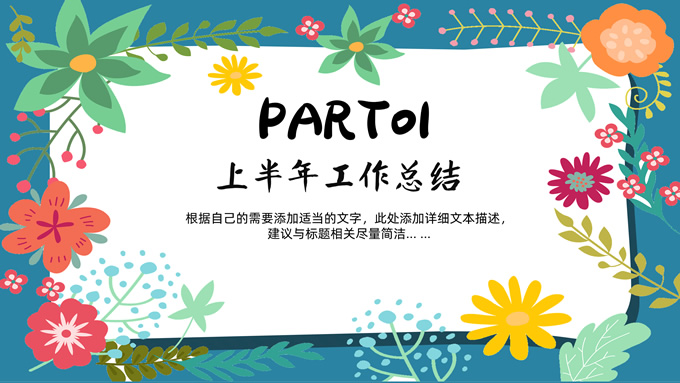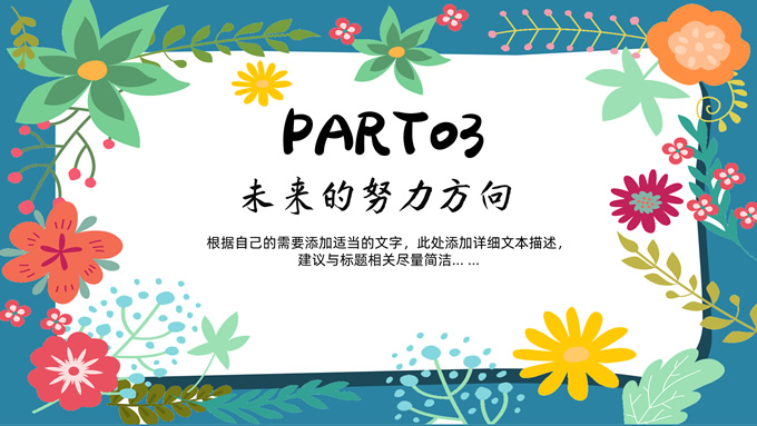 简介:矢量花朵藤蔓文艺清新工作汇报ppt模板,本模板共20P,纯蓝背景,矢量花朵藤蔓边框标题文字创意封面、目录页、过渡页,多色活力风文艺范版式内容页,扁平化图表,适合工作汇报、工作总结等场景应用的文艺风商务通用ppt模板。