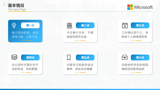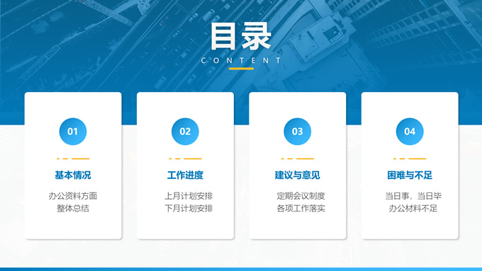 简介:完整框架超实用简约商务通用ppt模板,本模板共25P,目录:基本情况、工作进度、建议与意见、困难与不足,渐变蓝矩形框创意封面、过渡页,阴影风格图表,商务风版式内容页,适合工作总结、工作汇报等场景应用的商务通用ppt模板,含两套配色方案。