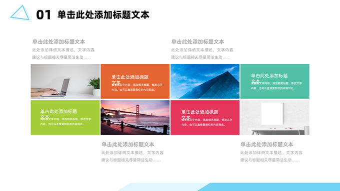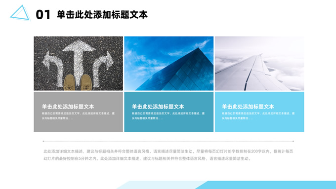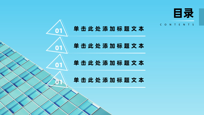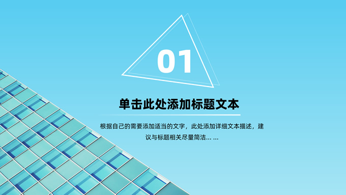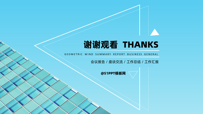 简介:几何风工作总结汇报商务通用ppt模板,本模板共16P,商务大楼局部特写背景,几何三角形线条标题文字极简封面、目录页、过渡页,小清新蓝配色,扁平化图表,适合工作总结、工作汇报等场景应用的商务通用ppt模板。