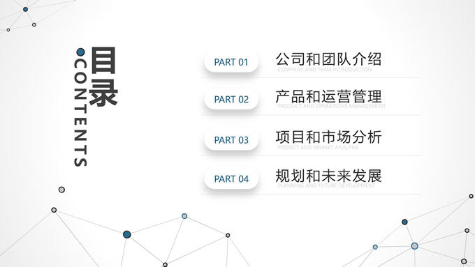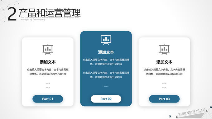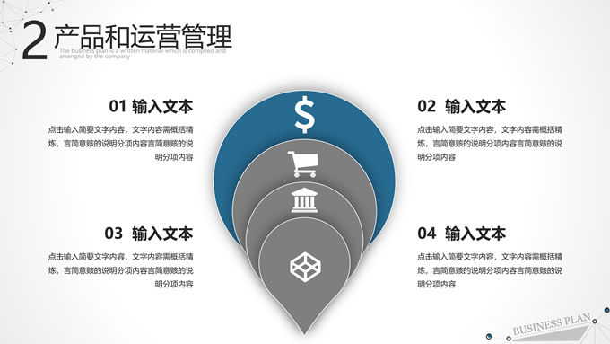 简介:点线几何简约商业计划书ppt模板,本模板共27P,目录:公司和团队介绍、产品和运营管理、项目和市场分析、规划和未来展望,淡雅灰背景,点线几何主图创意封面、目录页、过渡页,蓝灰配色,阴影风格图表,适合工作计划、工作总结、商业计划书等场景应用的商务通用ppt模板。