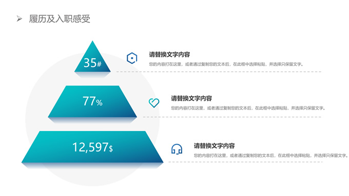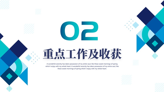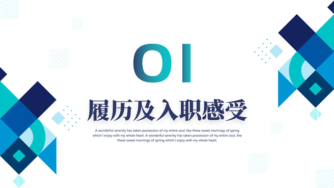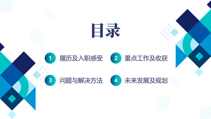 简介:精美几何风新员工述职报告ppt模板,本模板共25P,目录:履历及入职感受,重点工作及收获,问题与解决方法,未来发展及规划,精美时尚几何风创意设计封面、目录页、过渡页,渐变蓝配色,阴影风格图表,适合工作总结、工作汇报、工作述职报告等场景应用的几何风商务通用ppt模板。