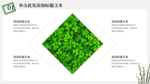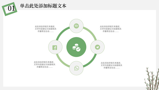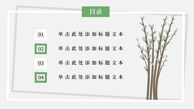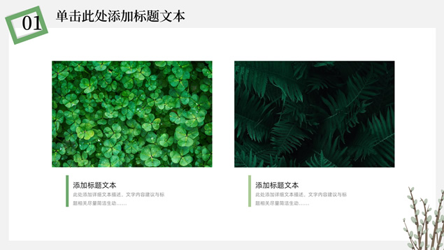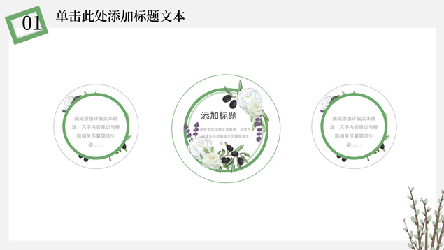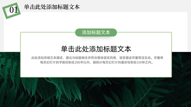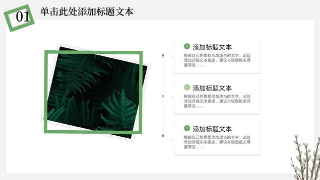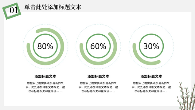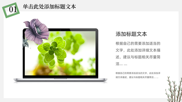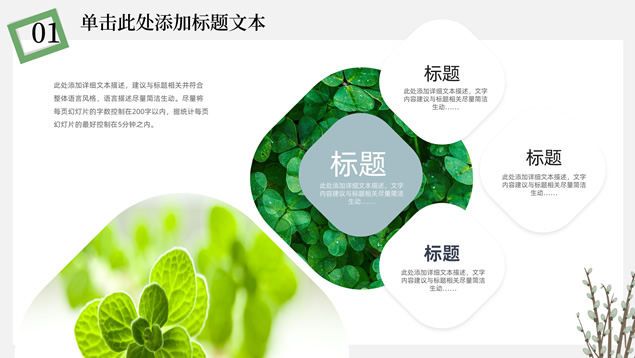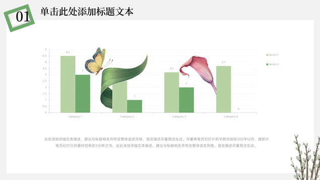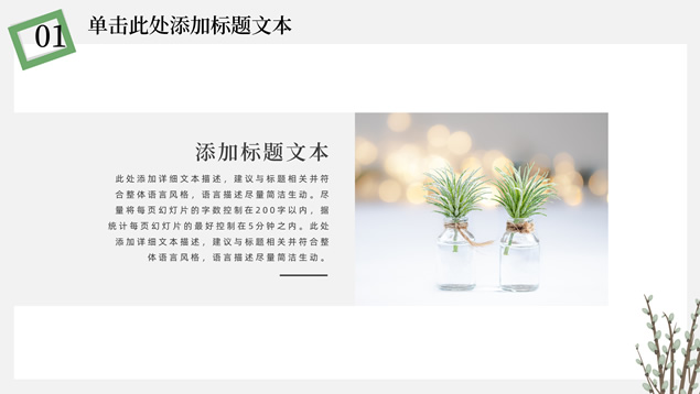 简介:简约清新文艺风总结汇报ppt模板,本模板共23P,淡雅纯灰背景,卡通植物主图白灰线条框文艺风简约封面、目录页、过渡页,小清新绿配色,简约扁平化图表,适合工作总结、工作汇报、述职报告等场景应用的文艺风商务通用ppt模板。