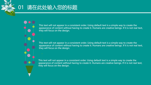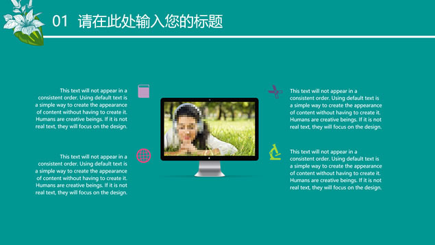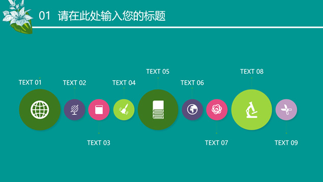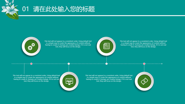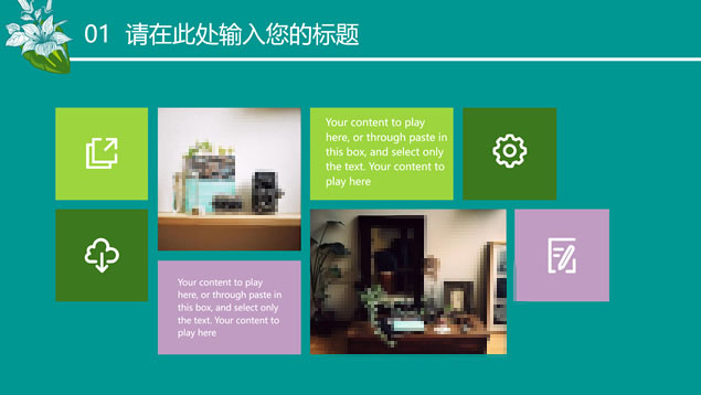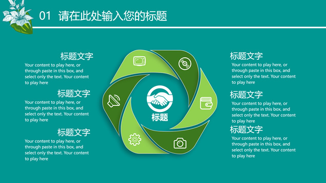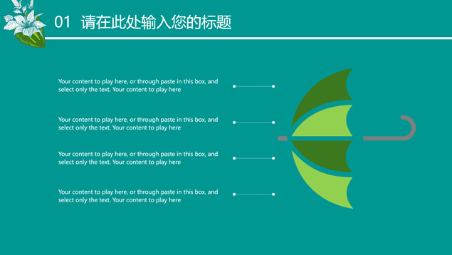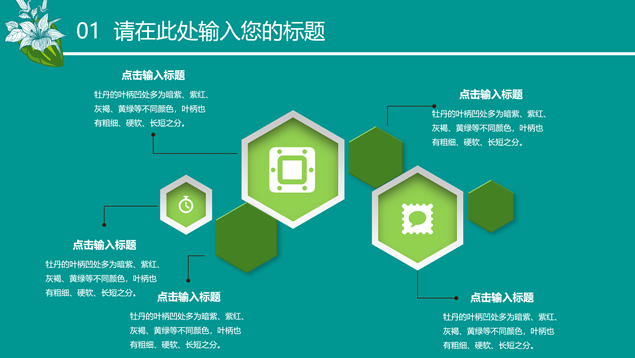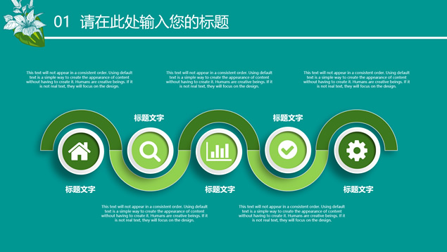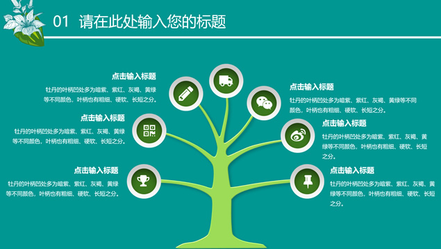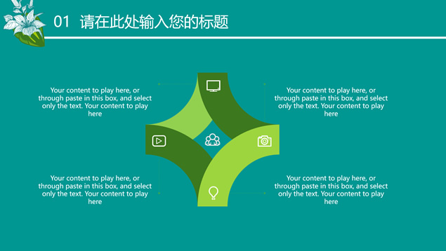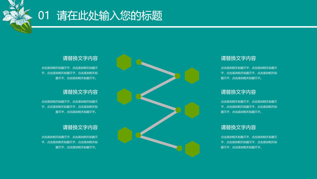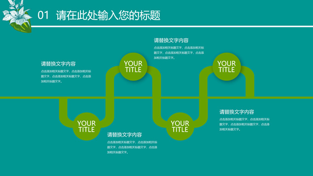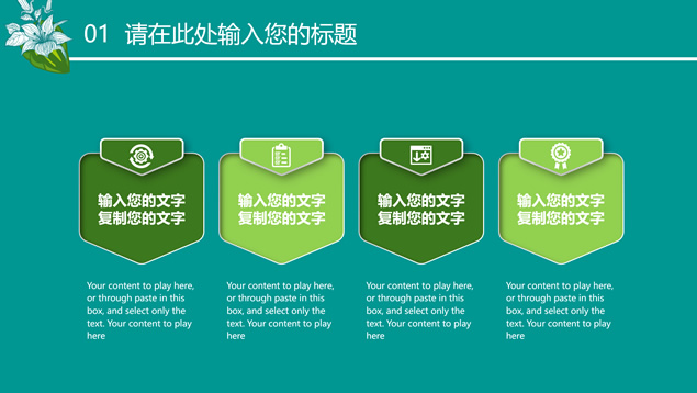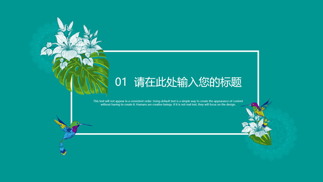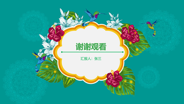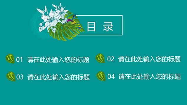 简介:花草鸟儿文艺清新风工作汇报ppt模板,本模板共23P,墨绿花边图案背景,花草鸟儿主图封面、目录页、过渡页,活力绿配色,微立体、扁平化两种风格图表,适合工作汇报、工作总结等场景应用的文艺风商务通用ppt模板。