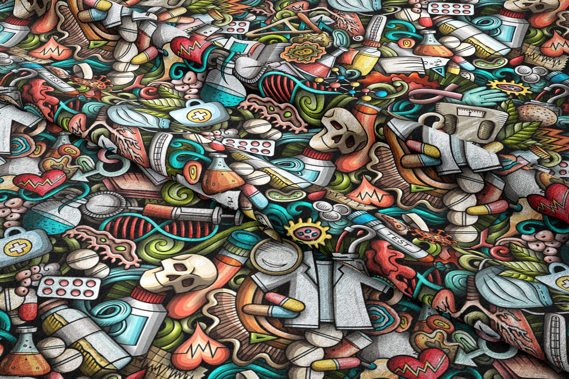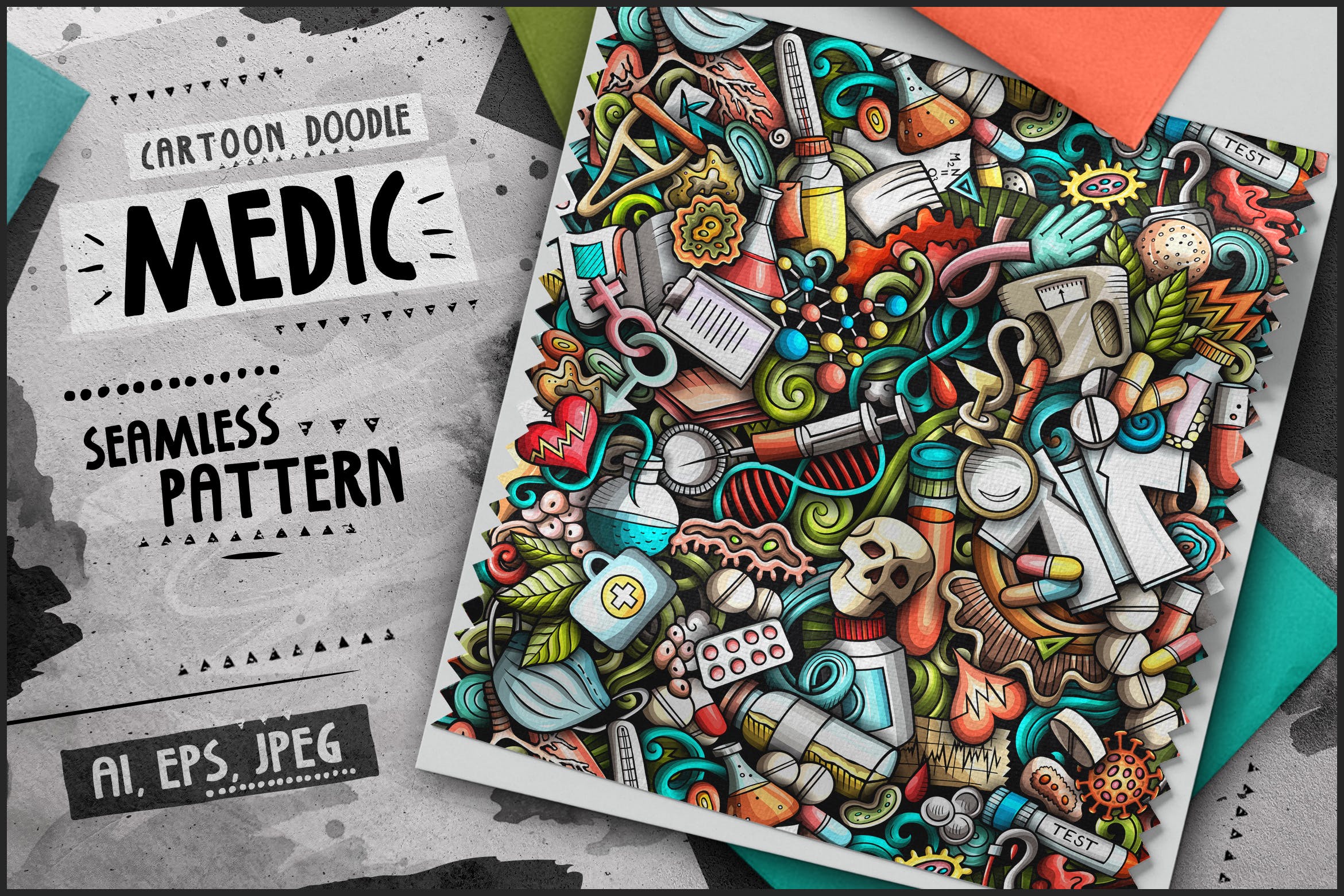 卡通涂鸦医学无缝图案,医学背景。卡通彩色矢量插画。包含AI、EPS和JPG(5000x5000px)文件。