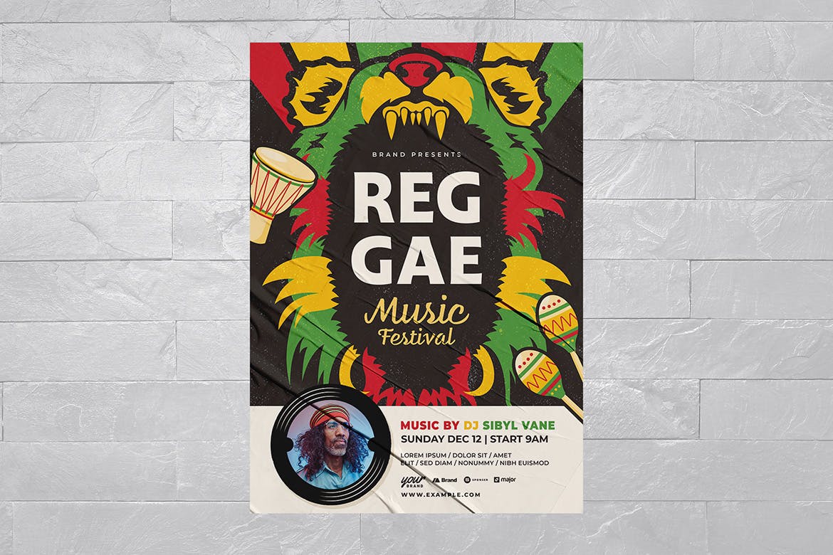 狮子的鬃毛构成了设计的边界,还装饰有鼓和沙球等乐器。设计的页脚有一个形状像黑胶唱片的图像占位符,旁边是用于活动详细信息和信息的文本区域。虽然设计时考虑了雷鬼,但此模板也适用于其他流派,如雷鬼、舞厅、斯卡、摇滚等。