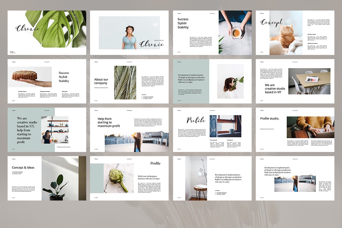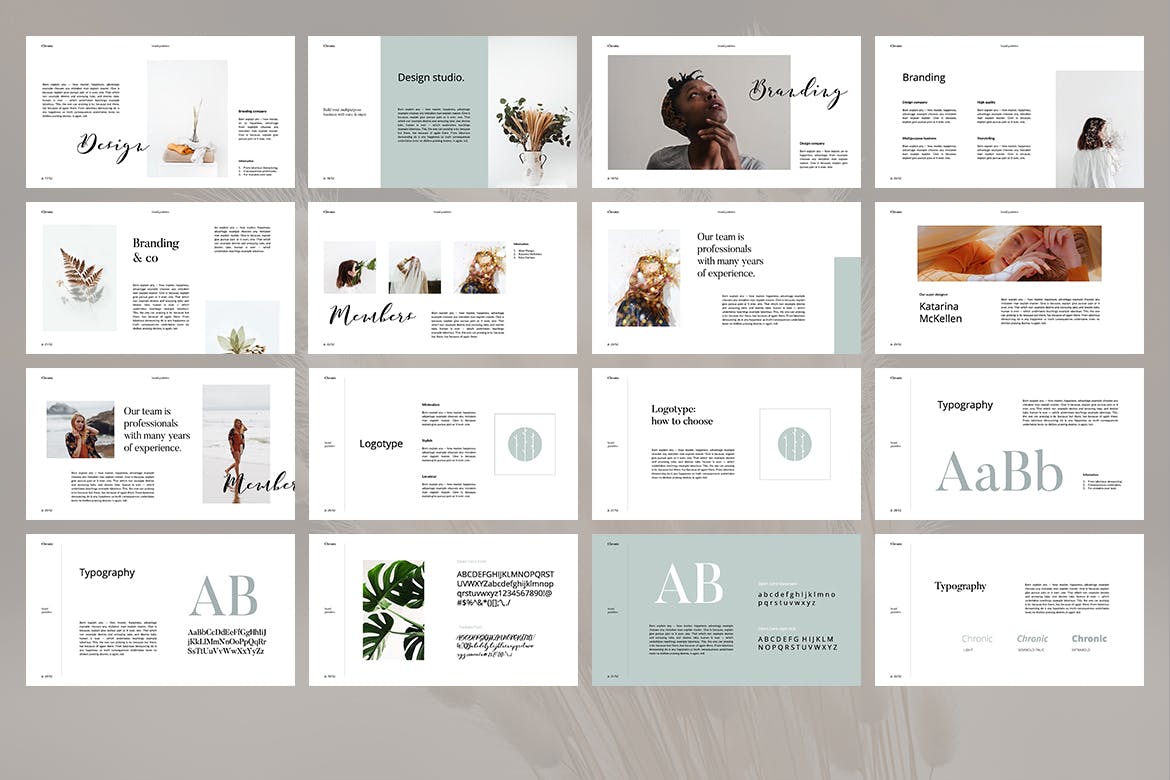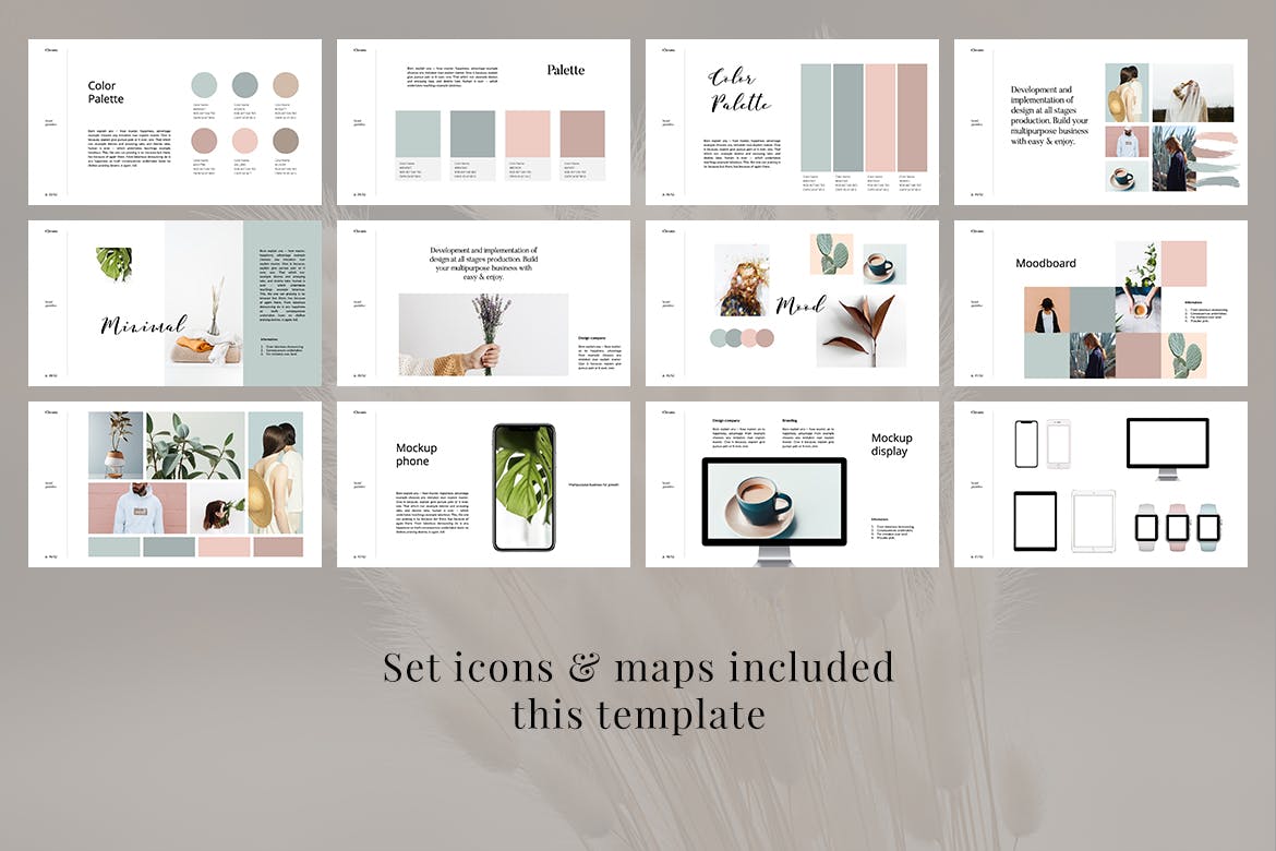 优雅绿植的优雅PPT模板下载,是您的多功能企业的品牌指南PowerPoint模板。此演示文稿带有地图和设置的图标。