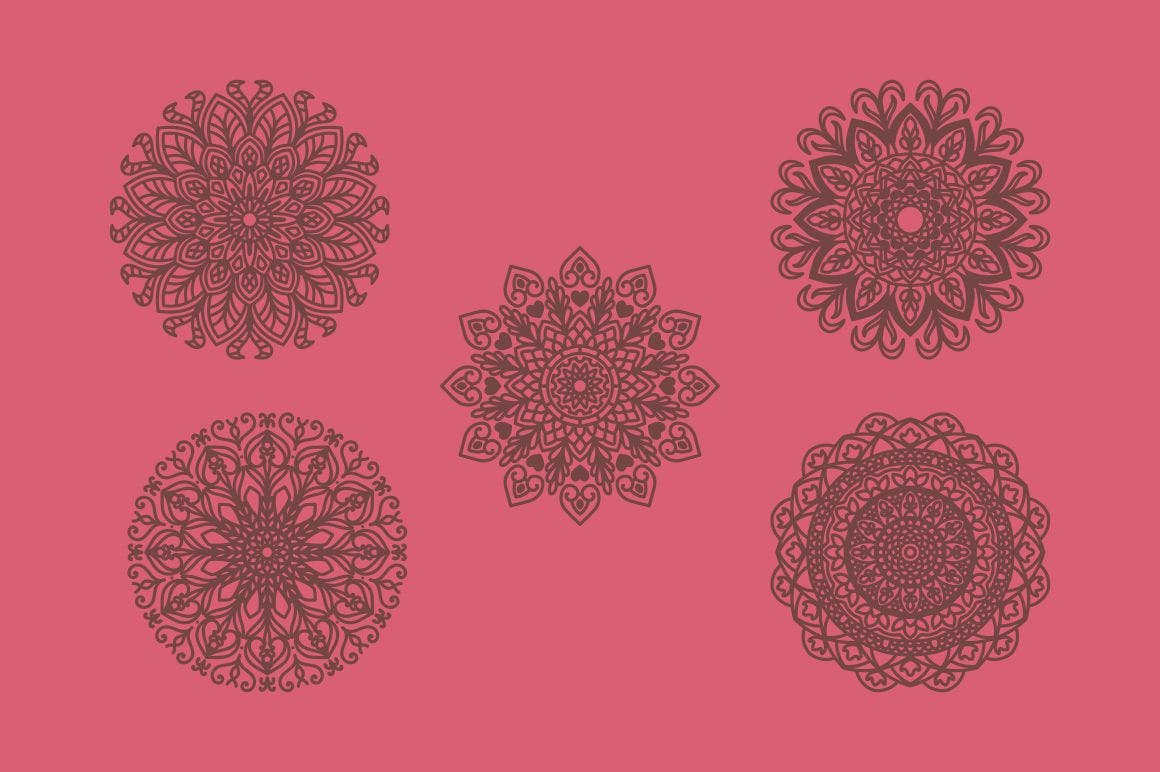 5个曼陀罗图案SVG设计素材,高分辨率,颜色可以更换,可用于装饰、手工艺、剪影、着色、贴花、衬衫、袋子、杯子、Logo以及您可以创造的任何东西!