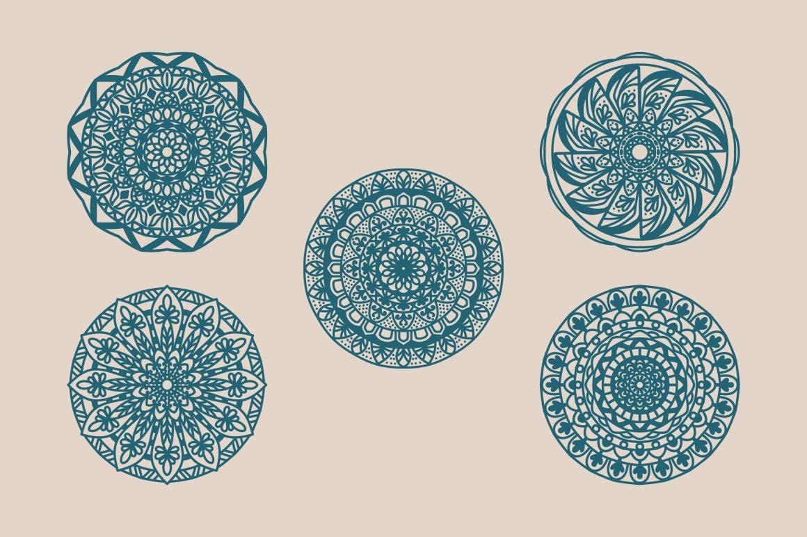 5个圆圈曼陀罗图案系列素材,高分辨率,颜色可以更换,可用于装饰、手工艺、剪影、着色、贴花、衬衫、袋子、杯子、Logo以及您可以创造的任何东西!