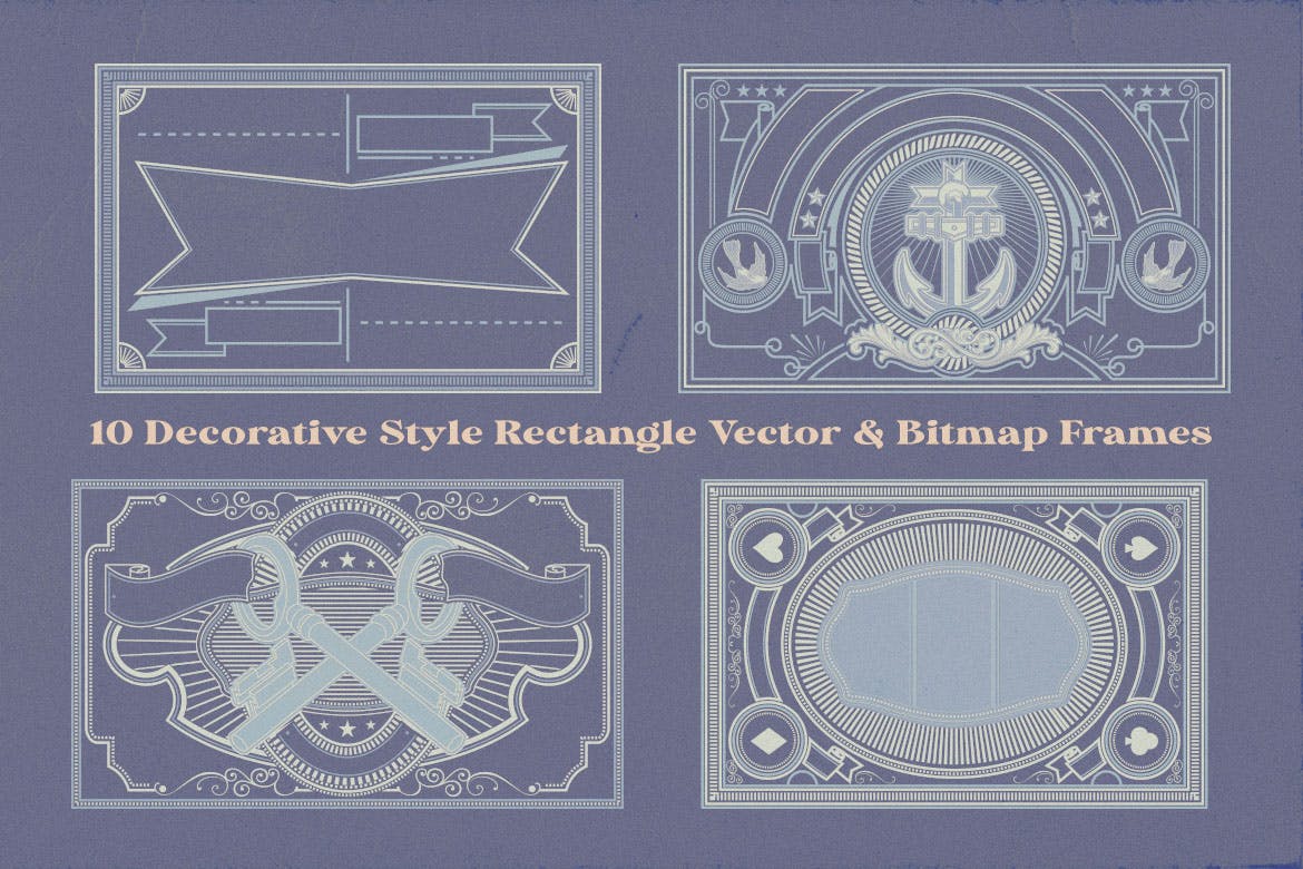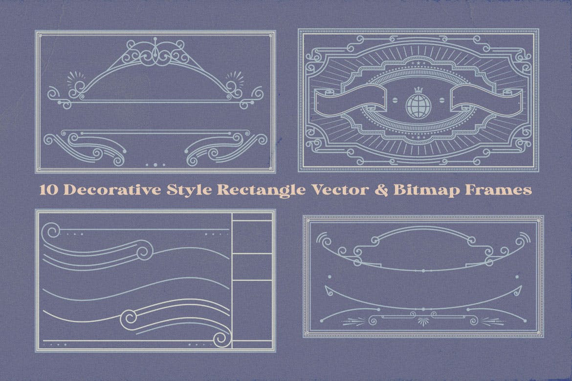 10 个矩形和复古/装饰风格的框架或装饰性背景设计,非常适合用作预览图像或网站或印刷设计的宣传图形。 完全可编辑 Adobe Illustrator AI 文件以及具有透明 PNG、分层 PSD 和 EPS 文件的位图软件。10 个矩形框架、背景、徽章或海报设计 – AI、EPS、PNG、PSD,非常适合网页或印刷设计。