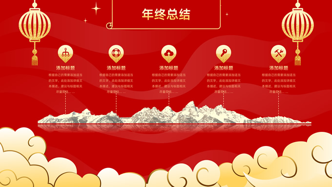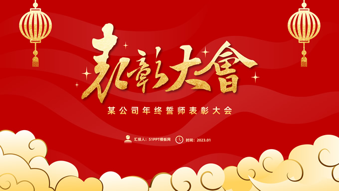 简介:喜庆春节风公司年终誓师表彰大会ppt模板,本模板共19P,目录:年终总结、颁奖表彰、文艺汇演、员工风采,红色飘带背景,金色祥云、灯笼春节元素毛笔字创意字体大气封面、目录页、过渡页,中国红配色,大气喜庆传统春节风版式内容页,适合公司年终表彰大会、年终汇报、企业年会等场景应用的公司年会通用ppt模板。