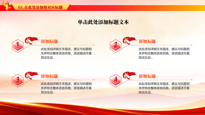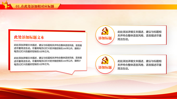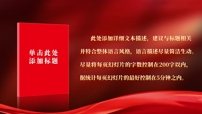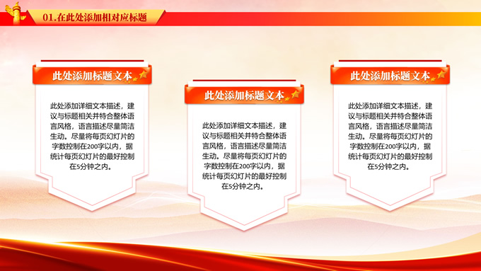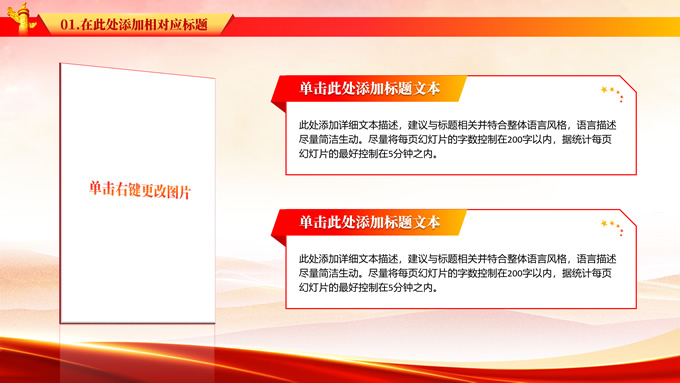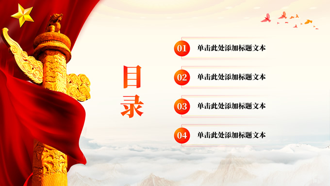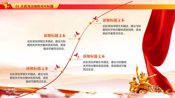 简介:红色奋斗百年路启航新征程党建ppt模板,本模板共10P,涵盖了封面页、目录页、过渡页、时间轴等几种版式,设计上采用中国红配色,包含中华柱、和平鸽、五角星等元素,版式大气实用,适合党建工作报告,党课课件,党建会议等场景应用,P界达人 大胆儿 作品。