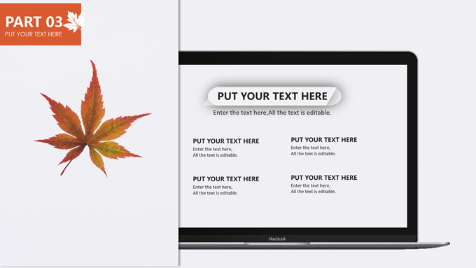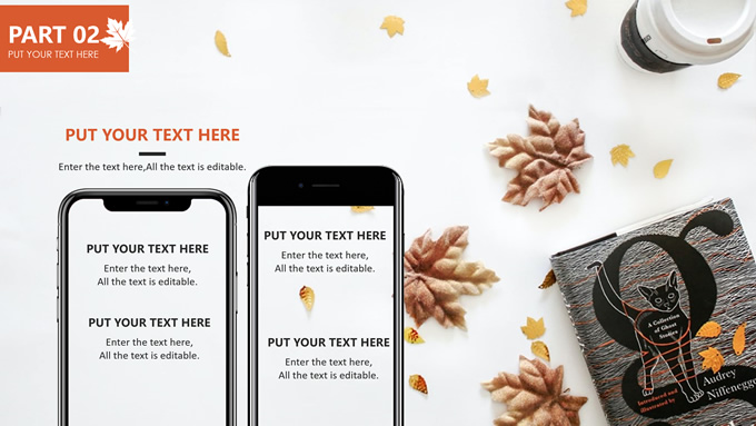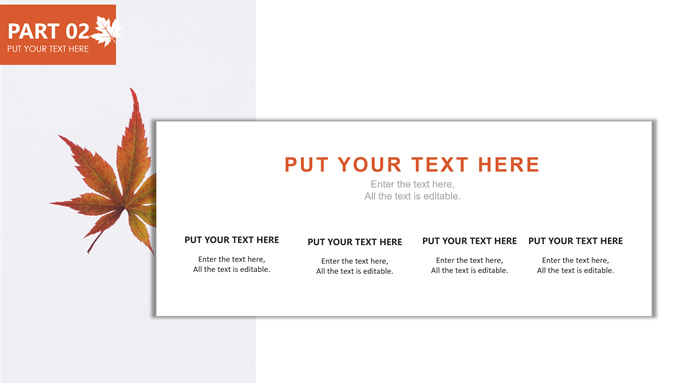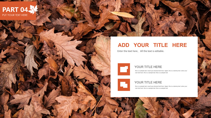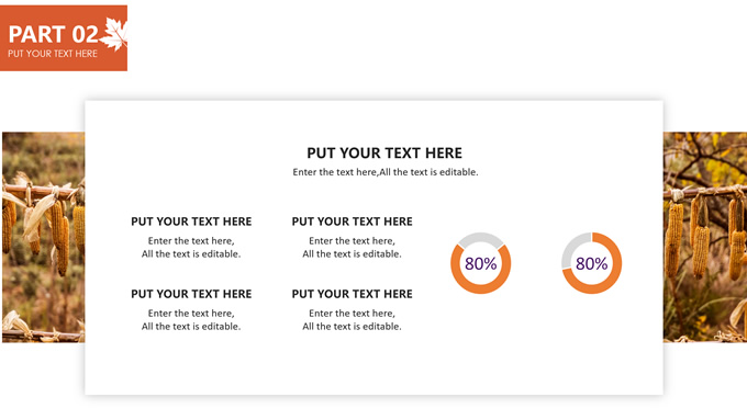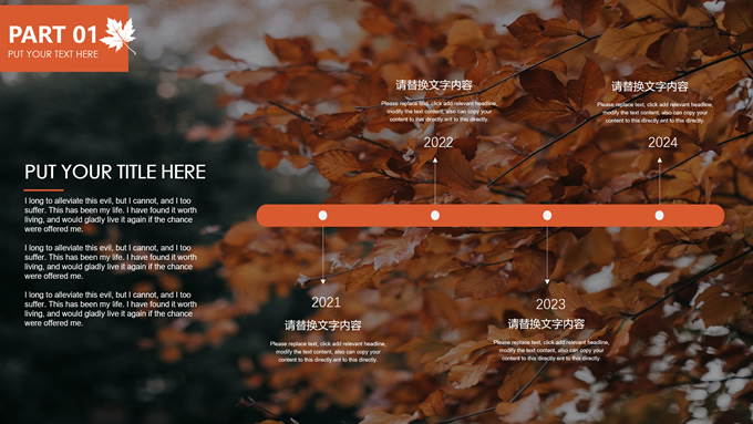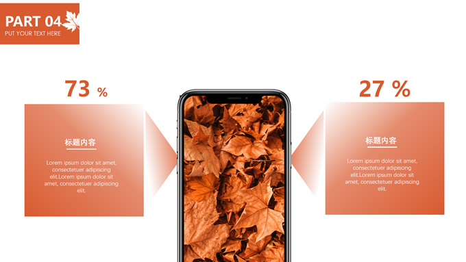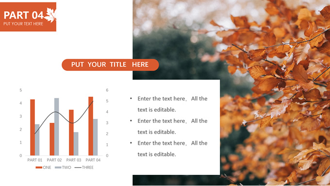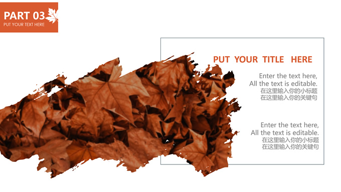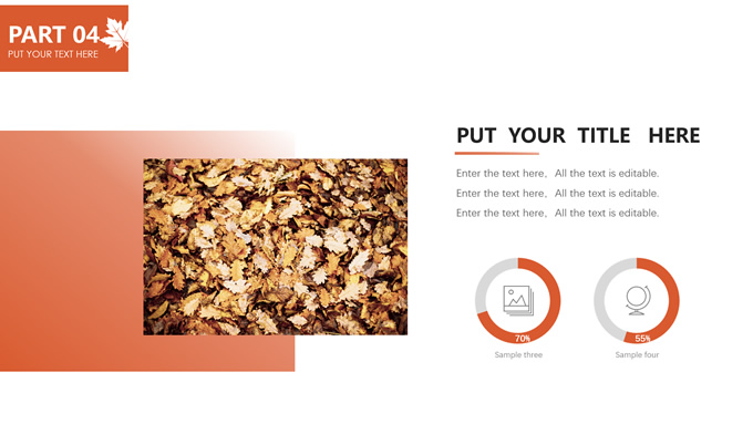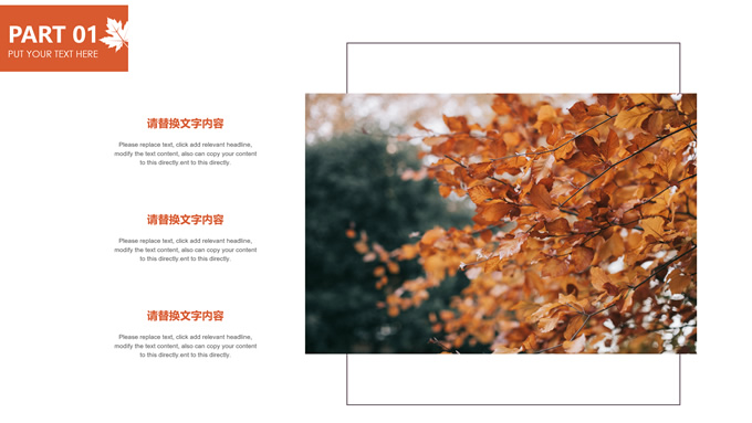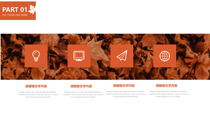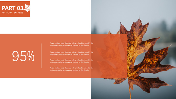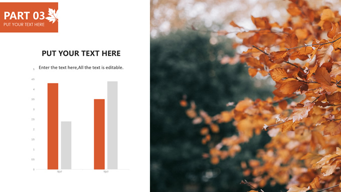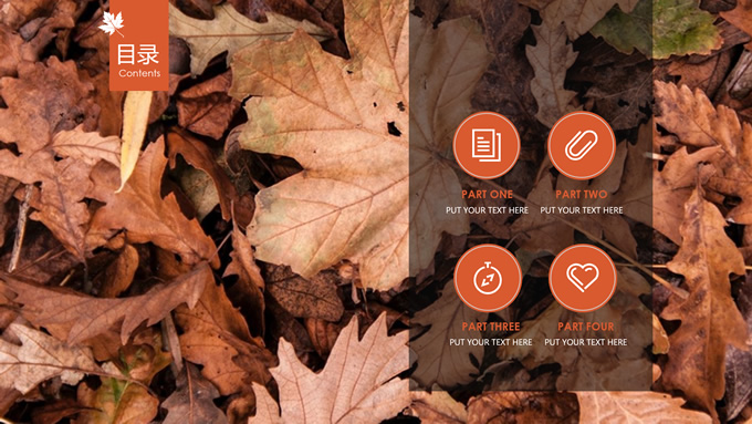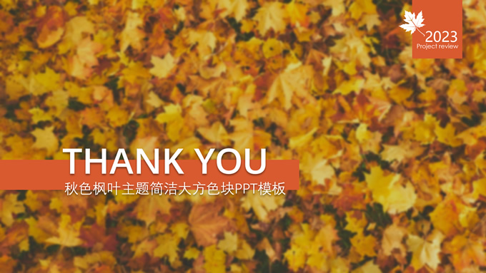 简介:秋意浓——简洁大方色块秋色主题ppt模板,本模板共20P,金色枫叶大图背景,几何块简约封面、目录页、过渡页,橙红配色,黄叶秋意主题图片配图扁平化图表内容页,适合工作汇报、工作总结等场景应用的秋天主题ppt模板。