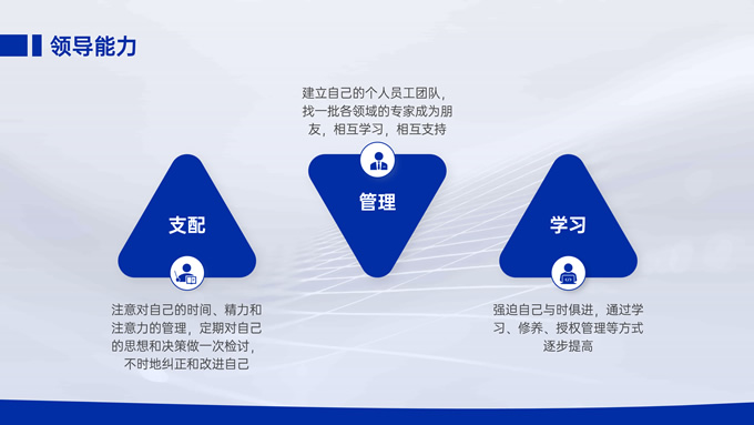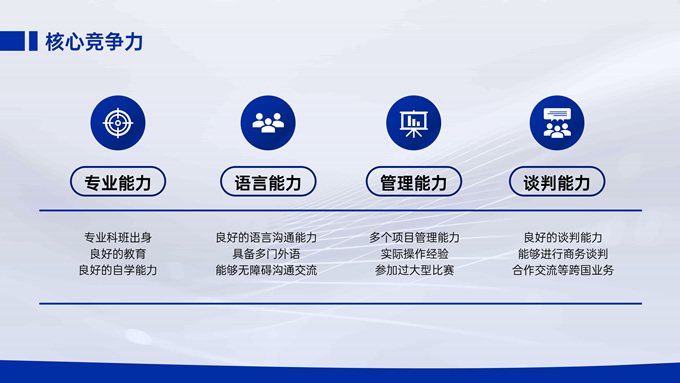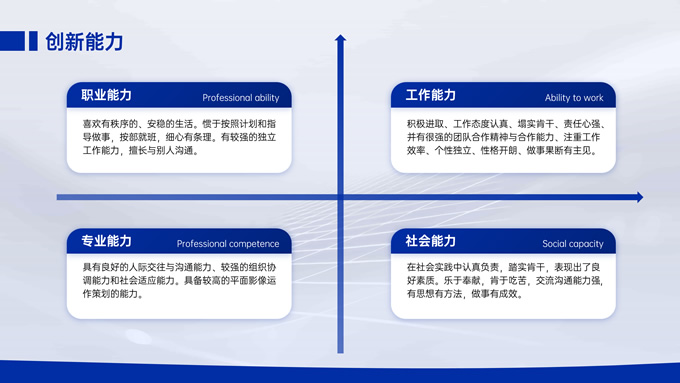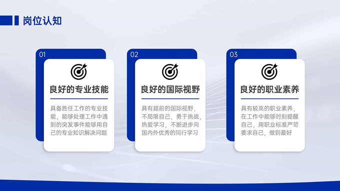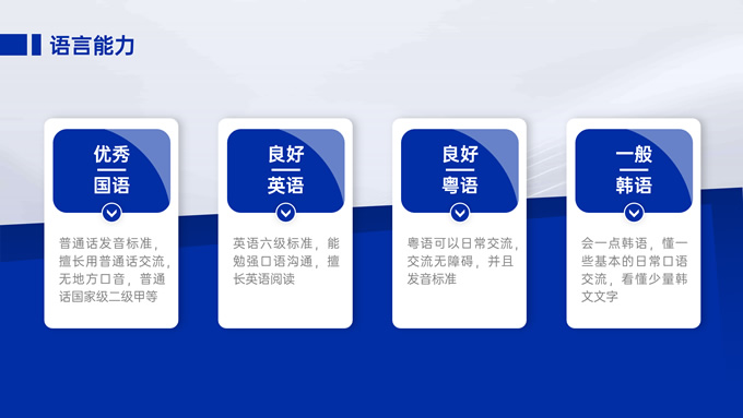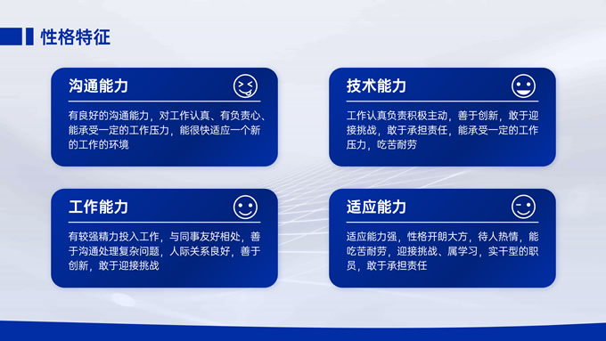 简介:简约几何蓝色商务风求职简历ppt模板,本模板共26P,这份个人简历是专为求职者设计的,包括个人简介、岗位认知、个人优势和未来规划,所有元素100%可编辑,支持一键换色和更换字体,你可以把这份简历用在你的求职过程中,P界达人 易宸 作品。