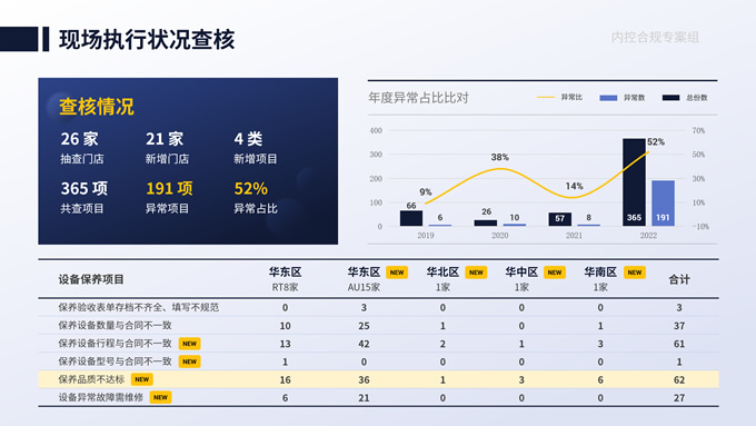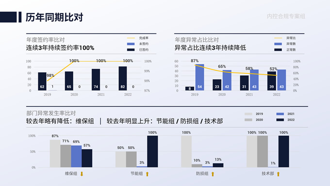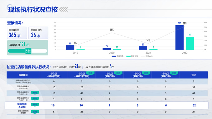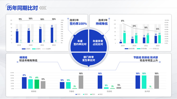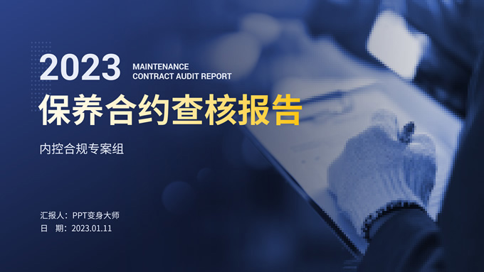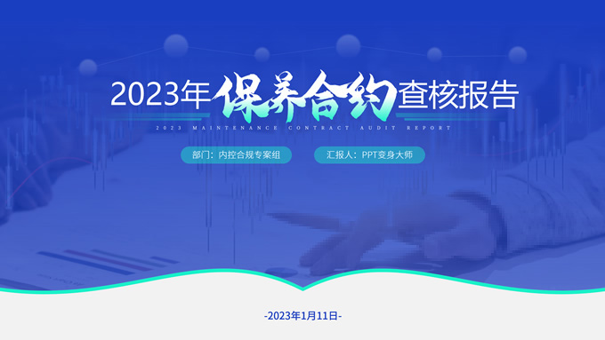 简介:蓝色商务风保养合约查核报告ppt模板,本模板共8P,科技蓝配色,简洁大气商务风版式设计,PPT竞技场查核报告篇小组优秀作品。