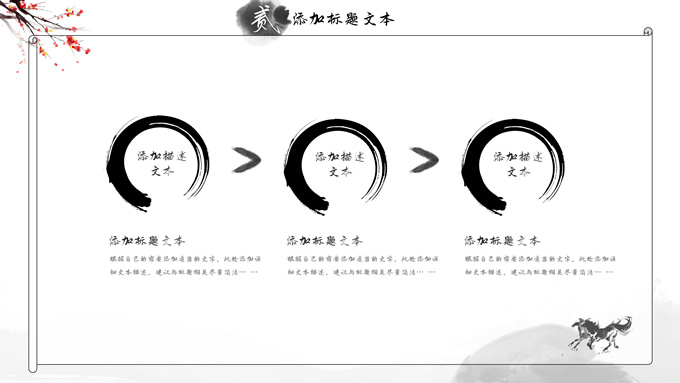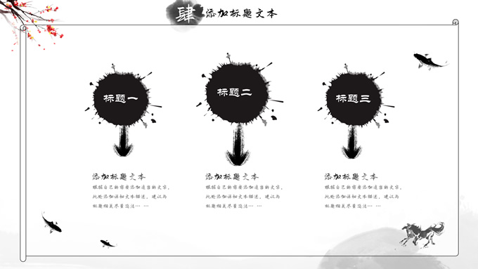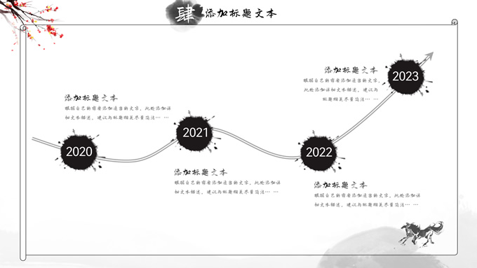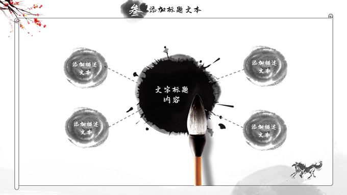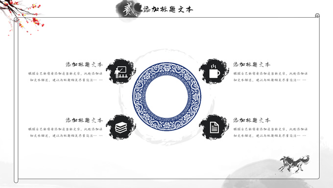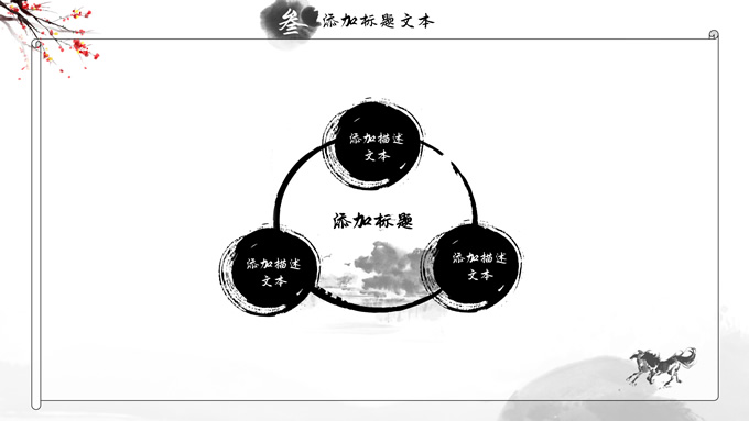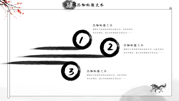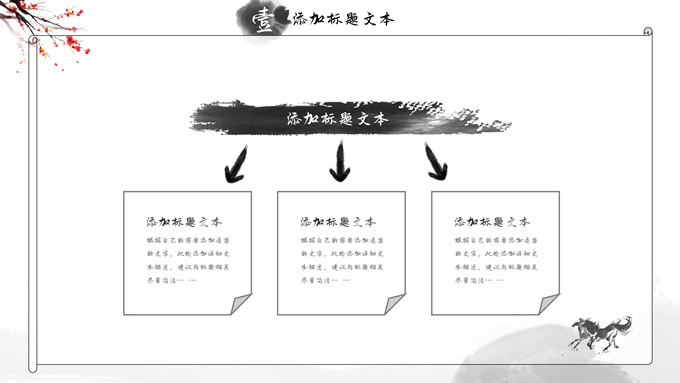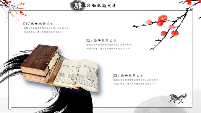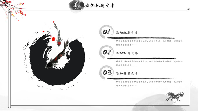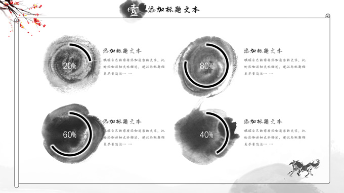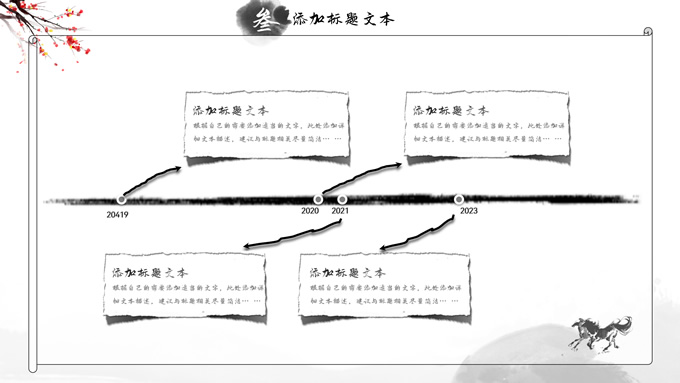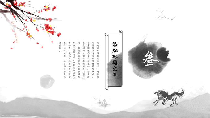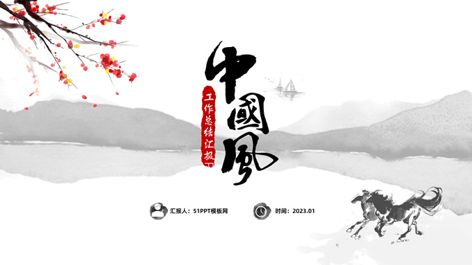 简介:大气中国风工作总结年终汇报ppt模板,本模板共23P,湖面水墨山川背景,腊梅、骏马、泛舟、水墨墨点、中国风毛笔字体创意封面、目录页、过渡页,经典灰配色,古典中国元素素材配图,水墨中国风版式内容页,适合工作汇报、工作总结、工作计划、年终总结等场景应用的大气中国风ppt模板。