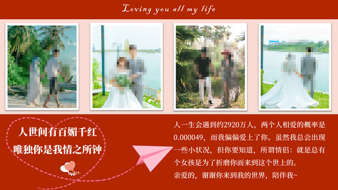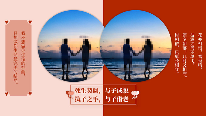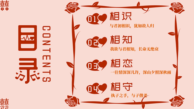 简介:表白 结婚通用红色复古风爱情相册ppt模板,本模板共15P,目录:相识(与君初相识,犹如故人归)、相知(我欲与君相知,长命无绝衰)、相恋(一往情深深几许,深山夕照深秋雨)、相守(执子之手,与子偕老),爱心、戒指、玫瑰、双喜、音符等爱情元素创意相册版式内容页,适合爱情表白、求婚、结婚等场景应用的爱情相册通用ppt模板,P界达人 菀青 作品。