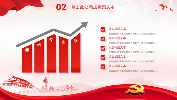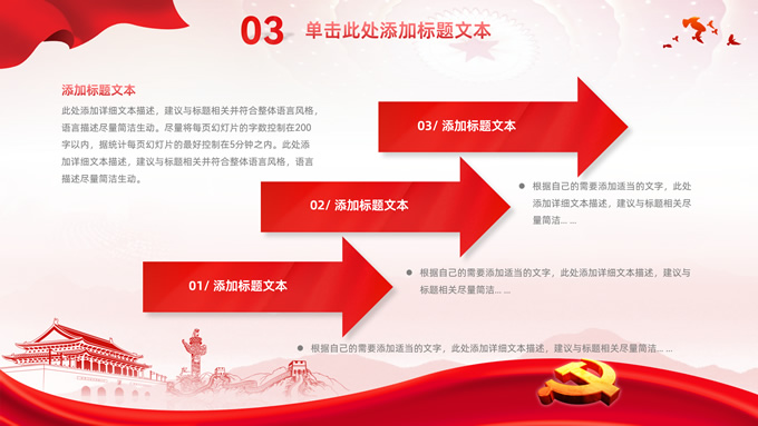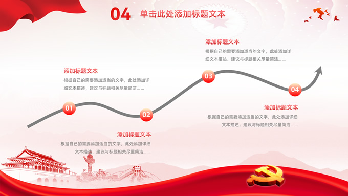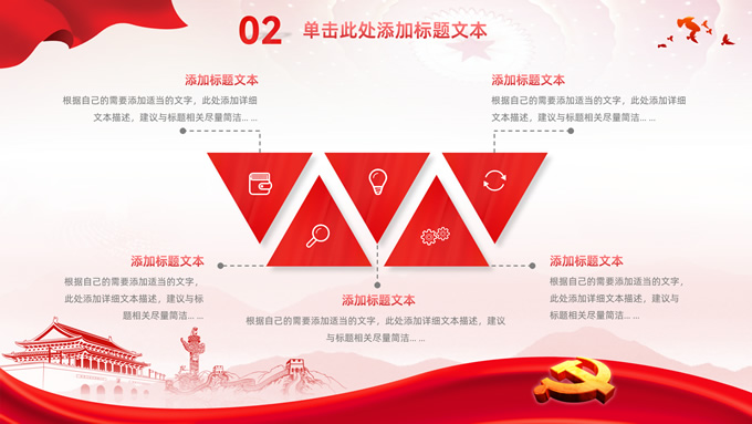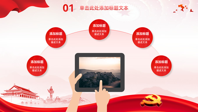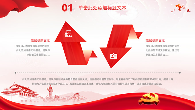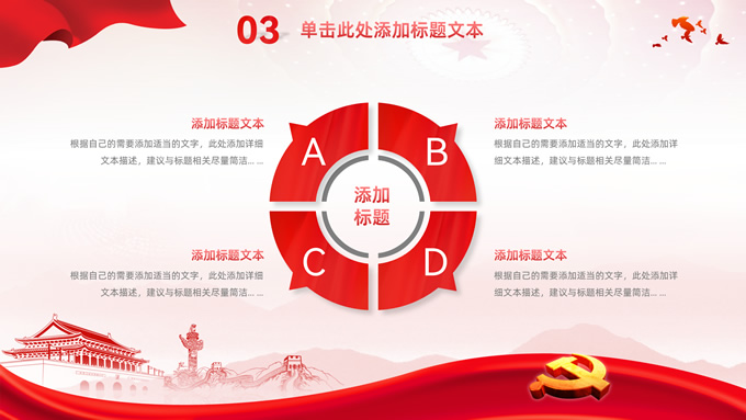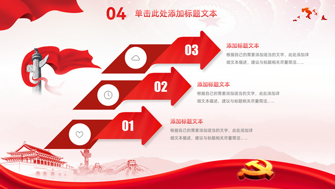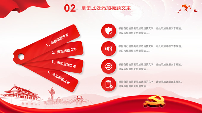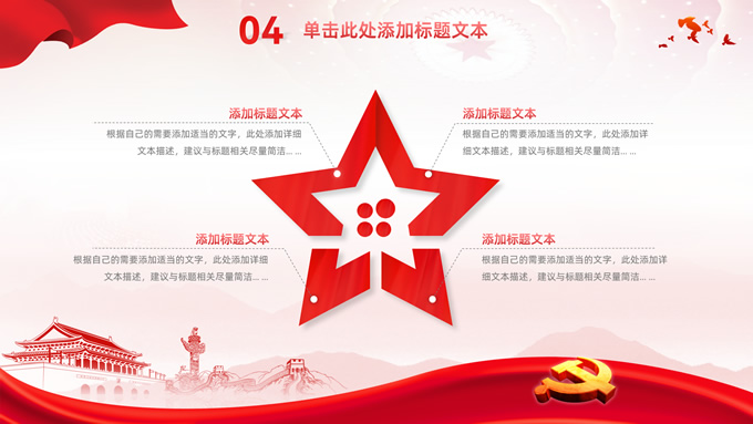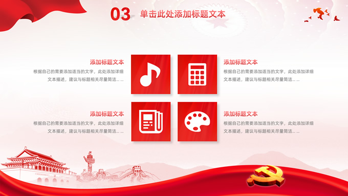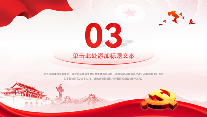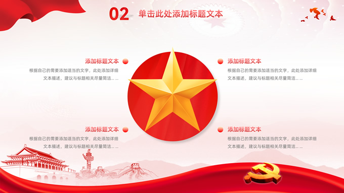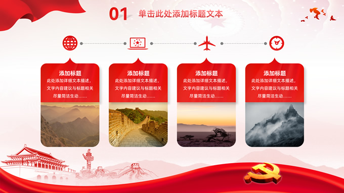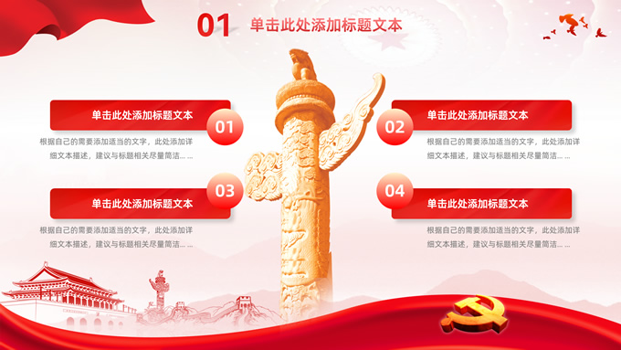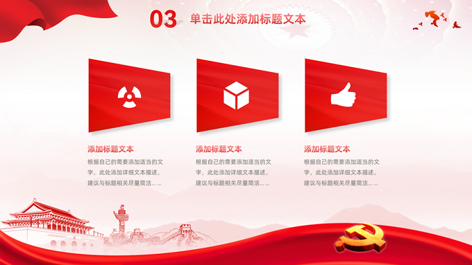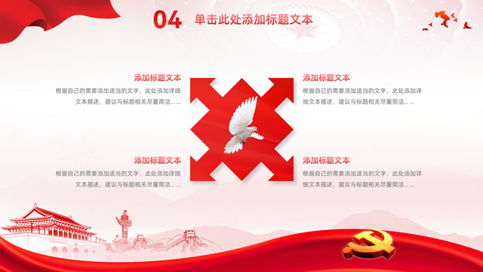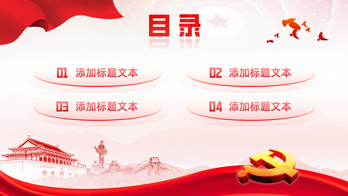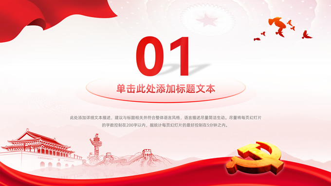 简介:共筑中国梦——党建工作汇报通用ppt模板,本模板共23P,金色党徽、飘带、旗帜、天安门、华表、万里长城、和平鸽元素标题字创意封面、目录页、过渡页,中国红配色,简约庄重党政风版式内容页,适合工作汇报、工作总结等场景应用的党建主题ppt模板。