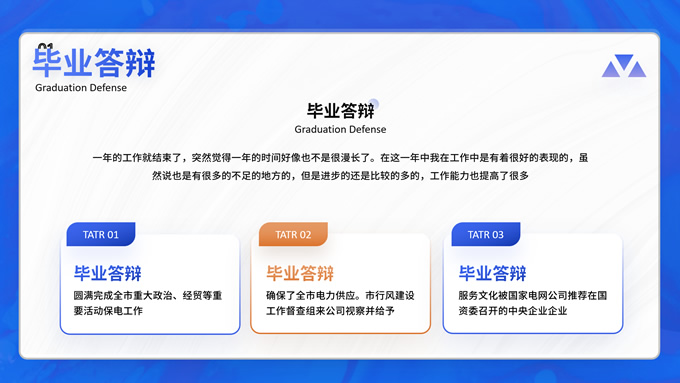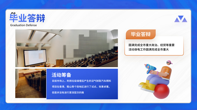 简介:3D插画风蓝色毕业答辩ppt模板,本模板共10页,本套模板是考虑到在校园里面答辩,选择了年轻化一点的3D建模,和其他的答辩显的少许不同也,版式也是使用了能改动较大的页面,无论是那个页面都容易改动,封面,过渡,目录,内容页等等,希望大家喜欢这个作品,P届达人 山道年 作品。