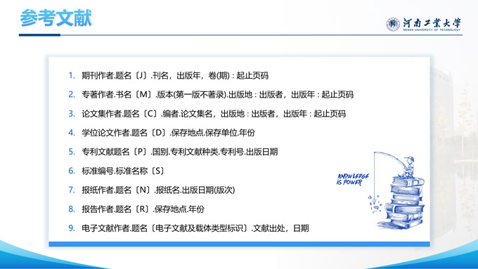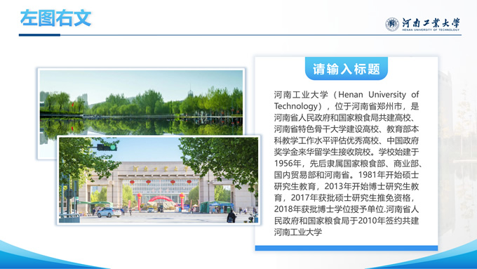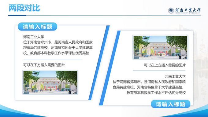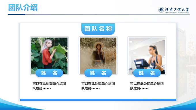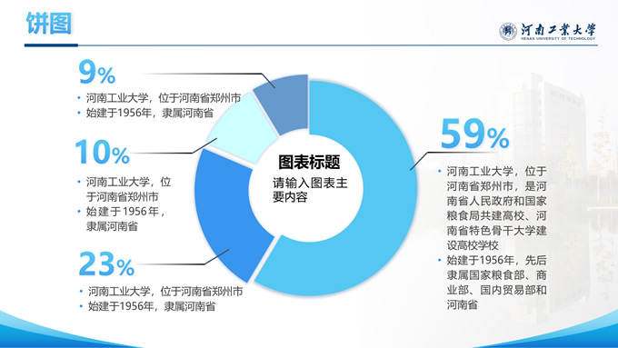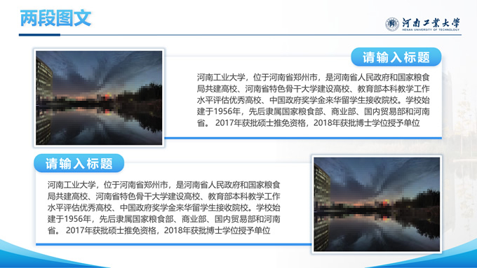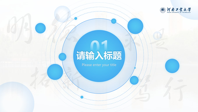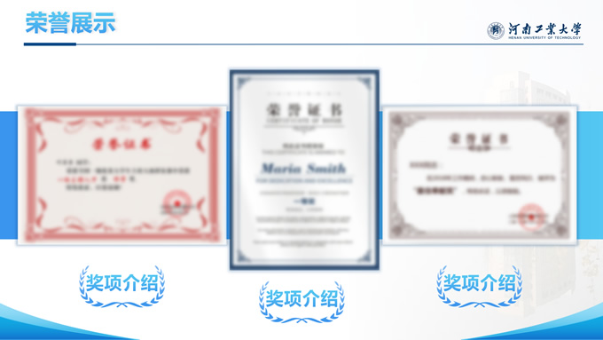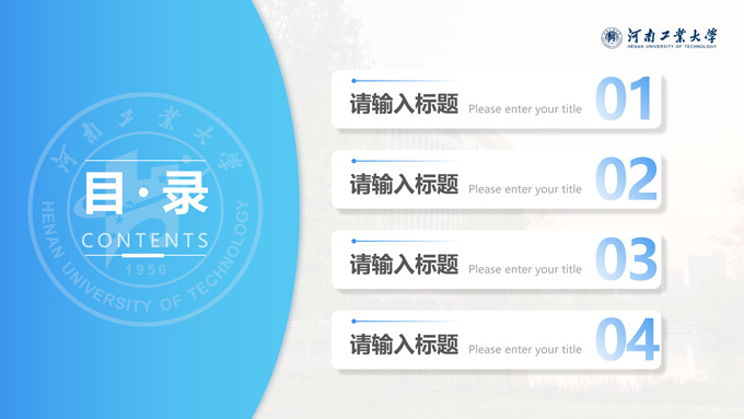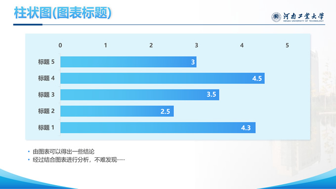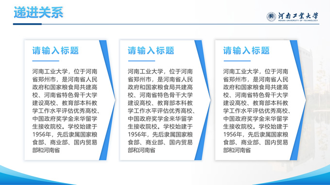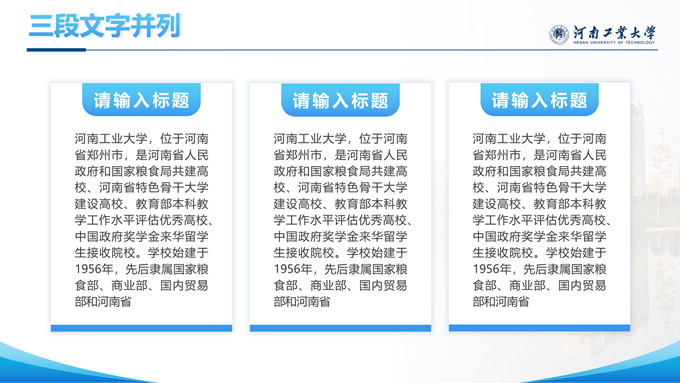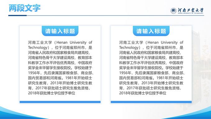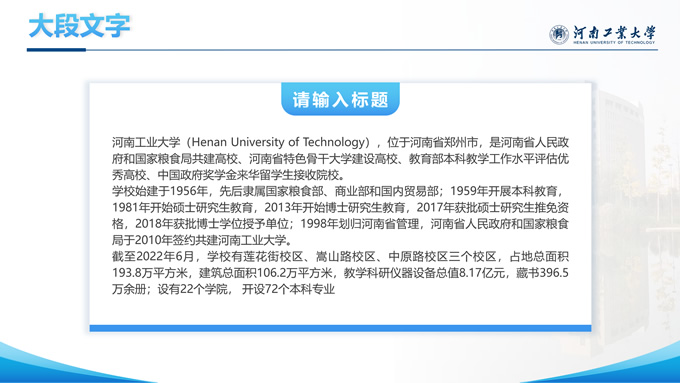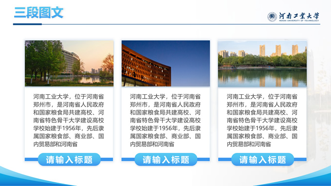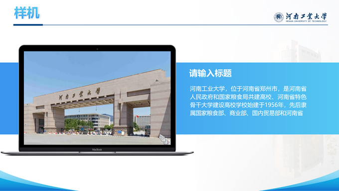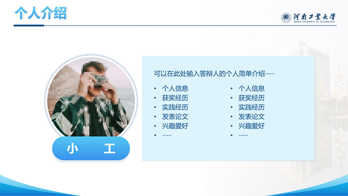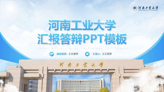 简介:河南工业大学论文答辩汇报通用ppt模板,本模板共28P,大学标志性大门建筑创意封面,几何元素设计目录页、过渡页,渐变蓝配色,包含文本页、图文页、图表页、样机页、参考文献、人物团队介绍页等多种版式结构,适合论文答辩、毕业总结、学术汇报等场景应用的河南工业大学通用型ppt模板。