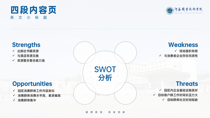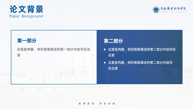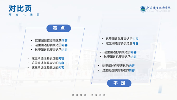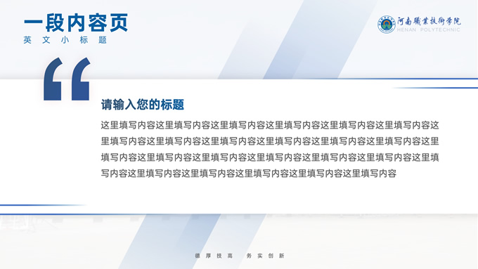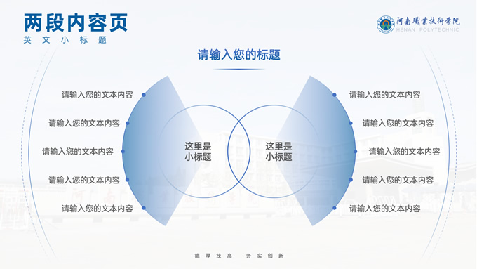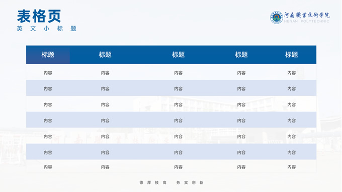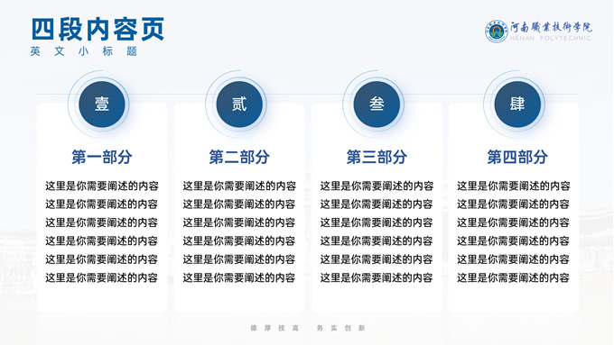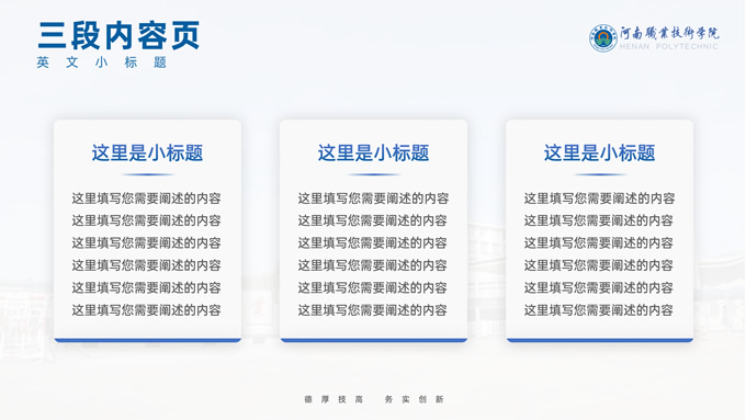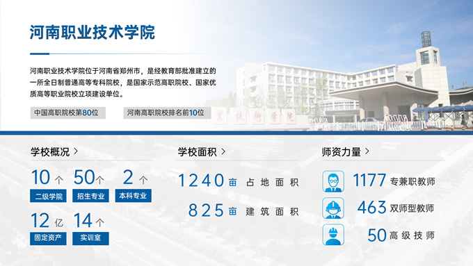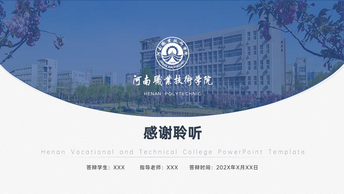 简介:河南职业技术学院汇报答辩通用ppt模板,本模板共13P,校园标志性建筑主图、校徽、简约蓝色风设计(校徽颜色)、简介页、目录页、过渡页、一段内容页、两段内容页、三段内容页、四段内容页、表格页、对比说明页,适合河南职业技术学院论文答辩、毕业汇报、答辩总结等场景应用的ppt模板,P界达人 源啊圆 作品。