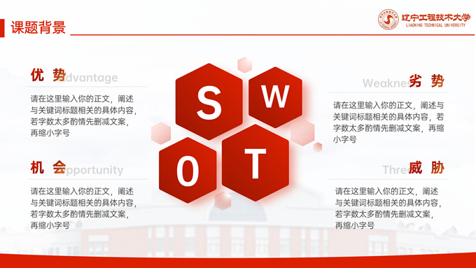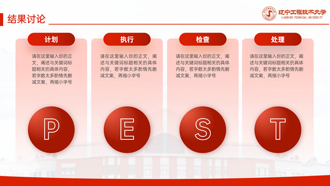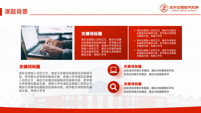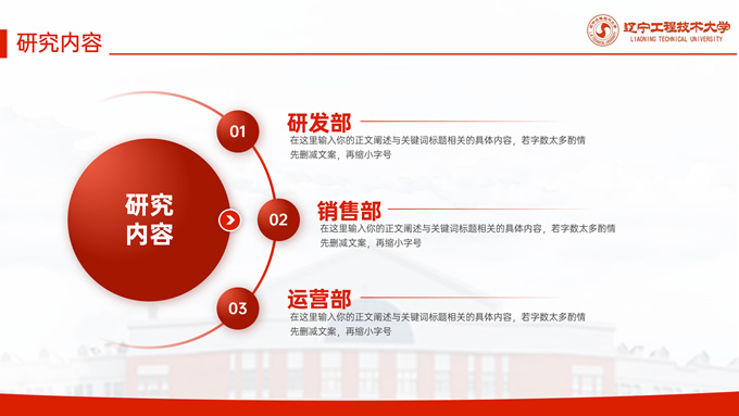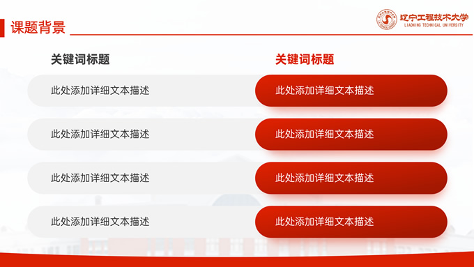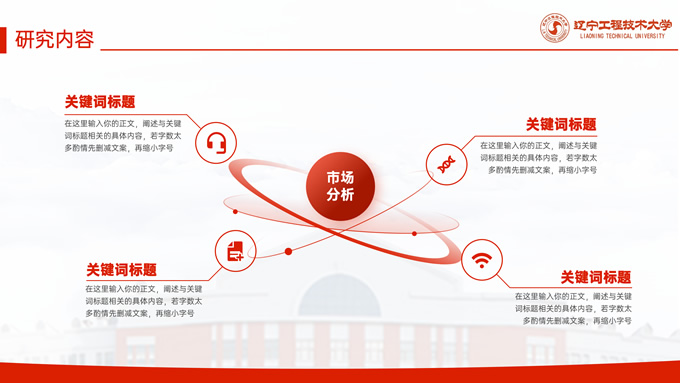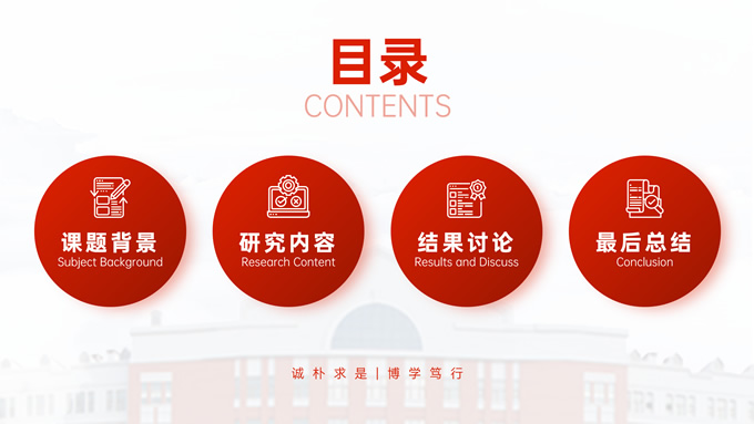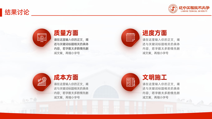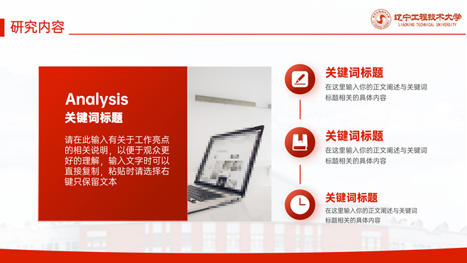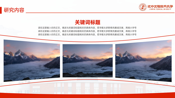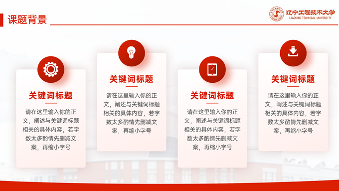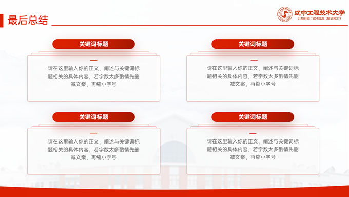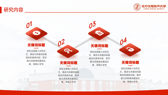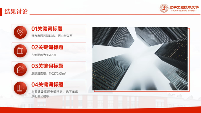 简介:辽宁工程技术大学毕业答辩通用ppt模板,本模板共27P,目录:课题背景、研究内容、结果讨论、最后总结,校园标志建筑大图几何线条标题文字封面、目录页、过渡页,渐变红配色,论文答辩通用版式内容页,适合答辩、总结、汇报等场景应用的辽宁工程技术大学通用ppt模板,P界达人 张紫怡 作品。