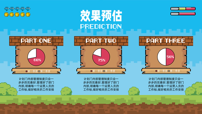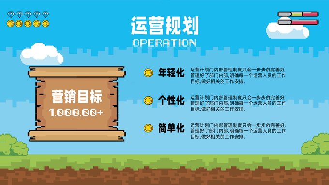 简介:游戏像素风活动策划ppt模板,本模板共15页,封面采用了勇者斗恶龙的场景设计,多数文字放在了画卷上,延续了整套模板的风格,文字也选用了像素风的字体,还原游戏中的感觉,大量元素可自由编辑组合,希望里面的一些元素,配色,能给你带来启发,P界达人 乌乌 作品。
