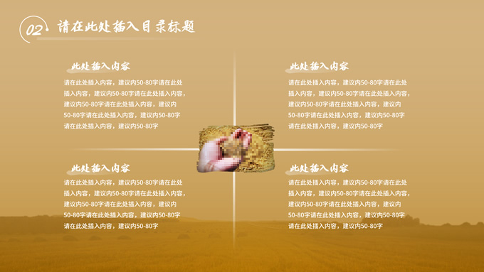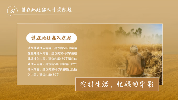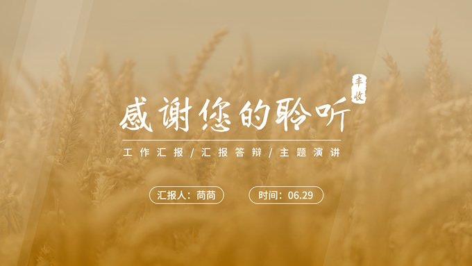 简介:稻黄色的世界丰收季工作汇报ppt模板,本模板共15P,金秋黄配色,半透明图表,丰收图片配图,简约版式内容页,适合丰收季工作汇报、汇报答辩、主题演讲等场景应用的稻黄色丰收主题ppt模板。