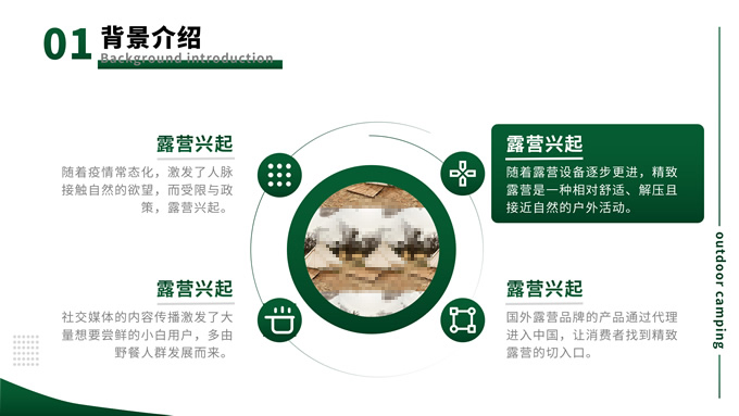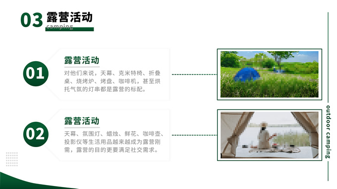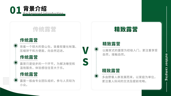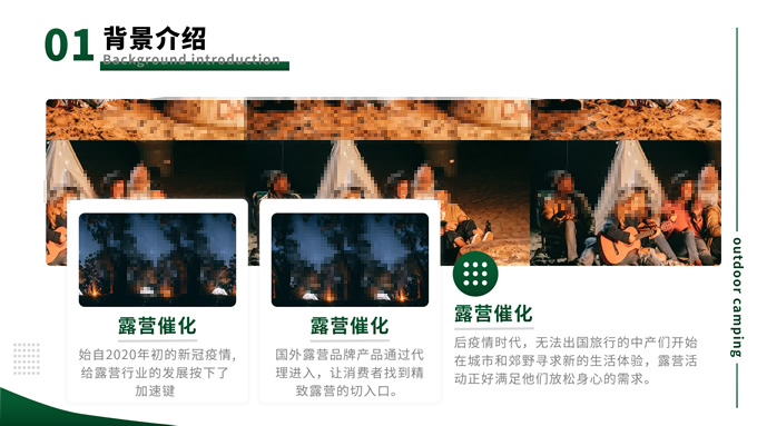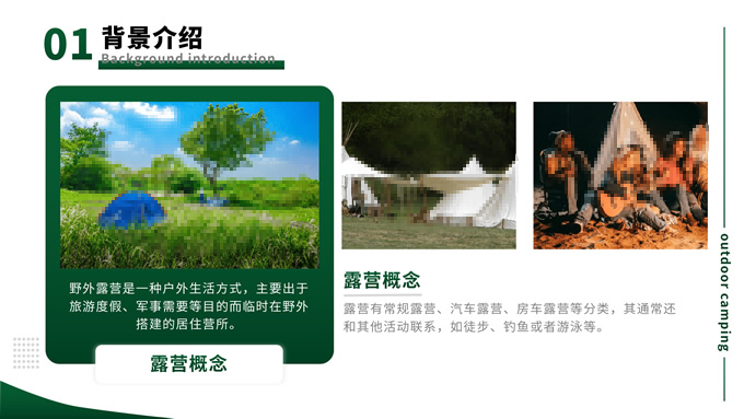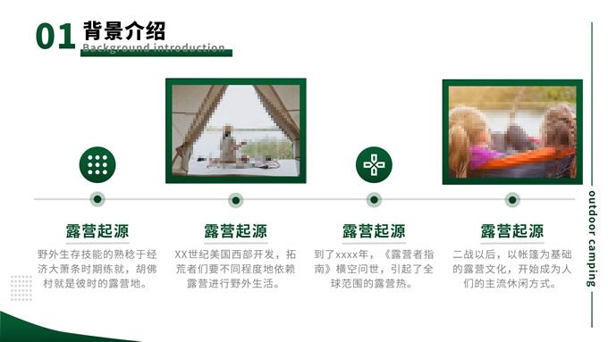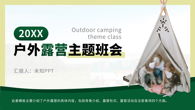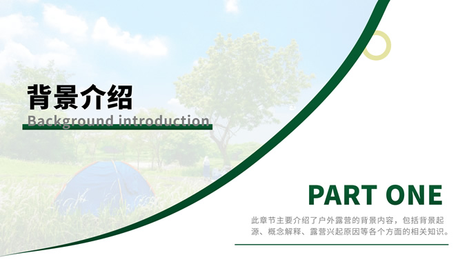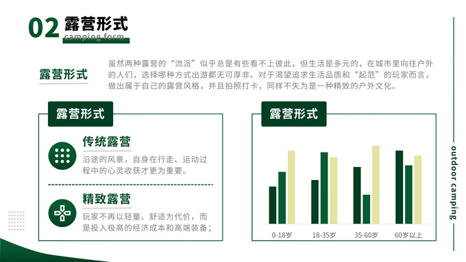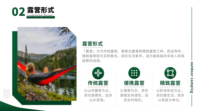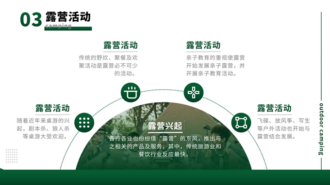 简介:绿色简约商务风户外露营主题班会ppt模板,本模板共13P,目录:背景介绍、露营形式、露营活动、注意事项,主题采用与露营相关的青山绿色,也有使用主题色,文字采摘于网络,版式较为完整的涵盖正文、图表、逻辑、目录、封面等页面,配图及文字均与主题相关,方便后期操作,P界达人 栗子 作品。