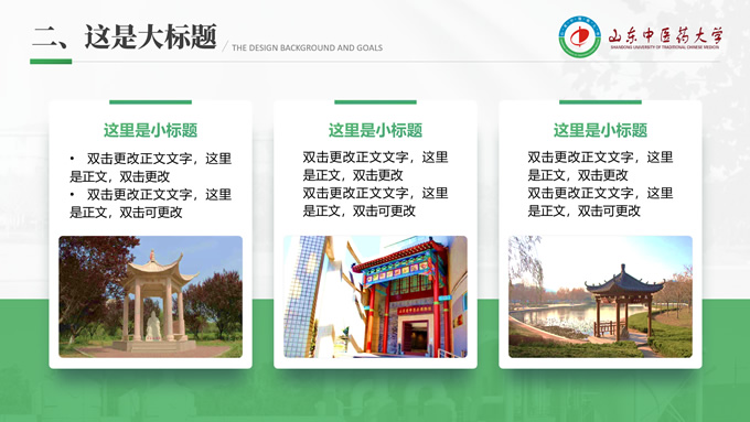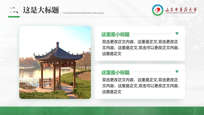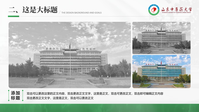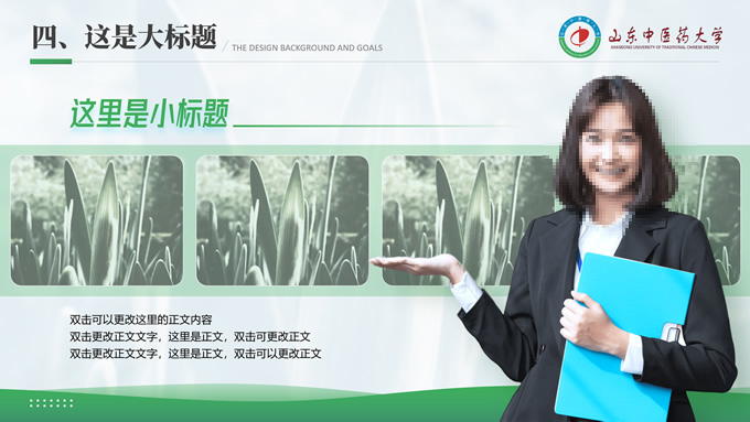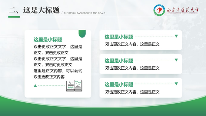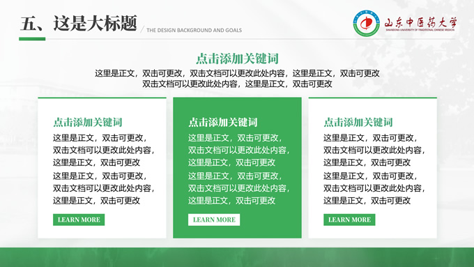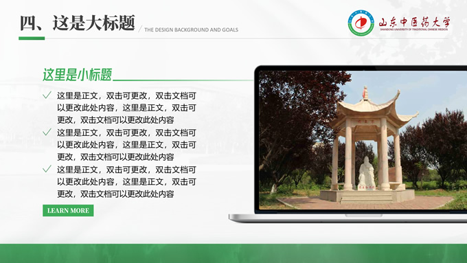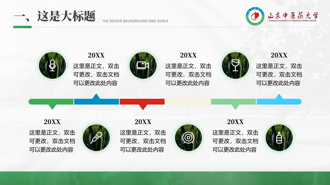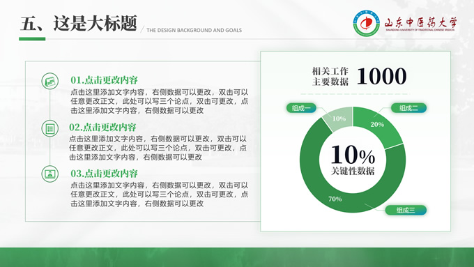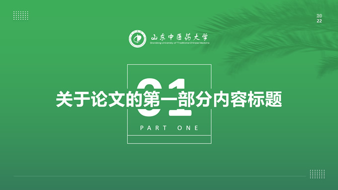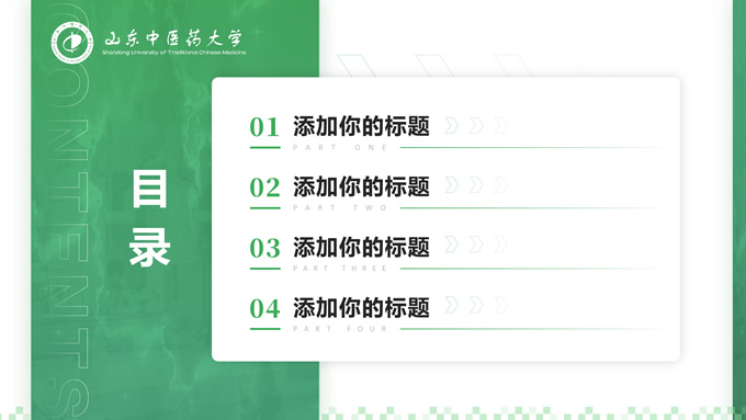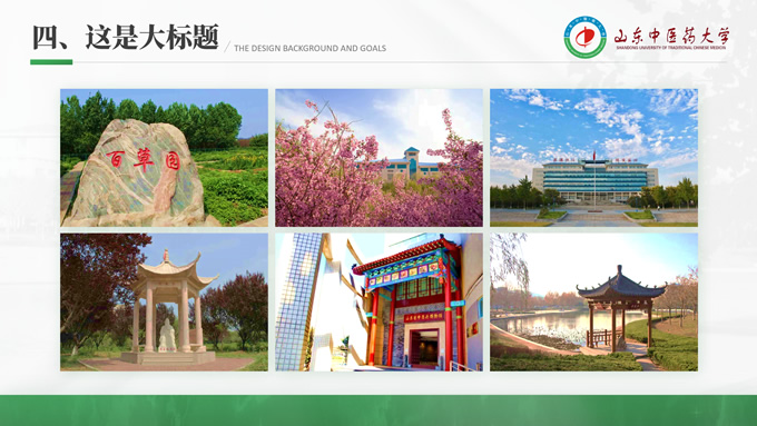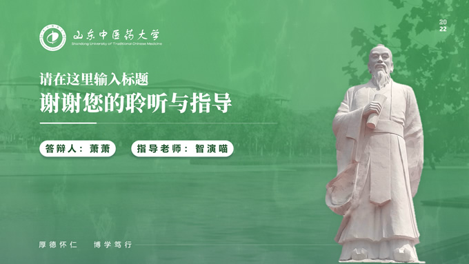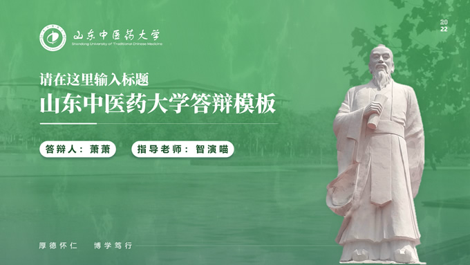 简介:山东中医药大学汇报答辩通用ppt模板,本模板共30P,目录:选题背景、国内外研究现状、目的与意义 、结果与结论、创新与不足,全图形校园风背景,配色采取蓝青色,体现青春气息,适合论文答辩、学生总结、学术汇报等场景应用的毕业答辩通用ppt模板,P界达人 萧萧 作品。