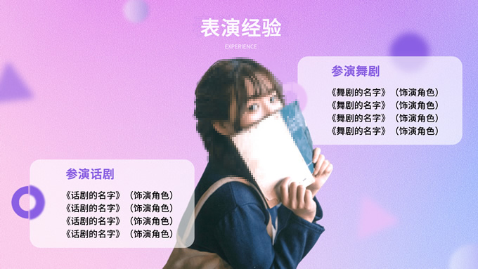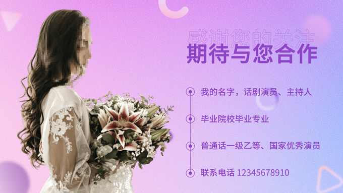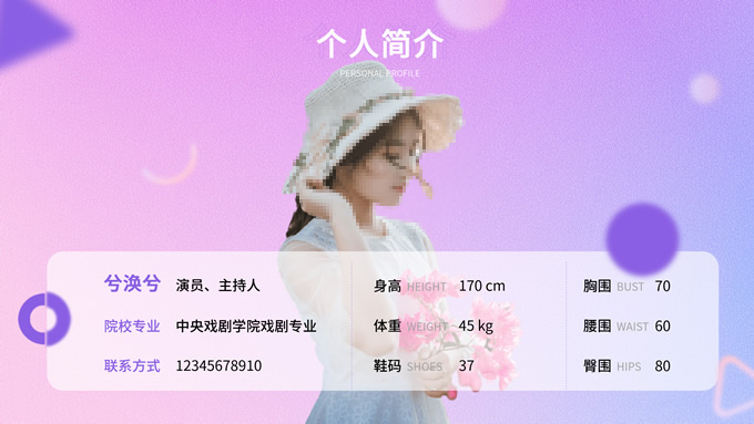 简介:主持人演员艺人个人简历ppt模板,本模板共12P,这是一份女演员或者女主持人的个人简历模版,涵盖封面、内容和结尾页,以浅浅的紫色、蓝色和粉色为主色的弥散风背景,主要是想表现出甜美浪漫的感觉,背景还做出了一点磨砂质感,更显朦胧梦幻,装点元素和色块采用的圆角形状,进行边缘柔化和渐变处理,大部分页面用的是漂浮球状来承载文字,符合浪漫甜美的基调,又增添了灵动和空间感,P界达人 若琳 作品。