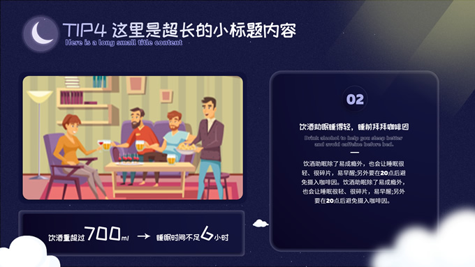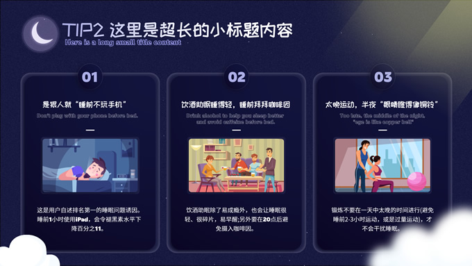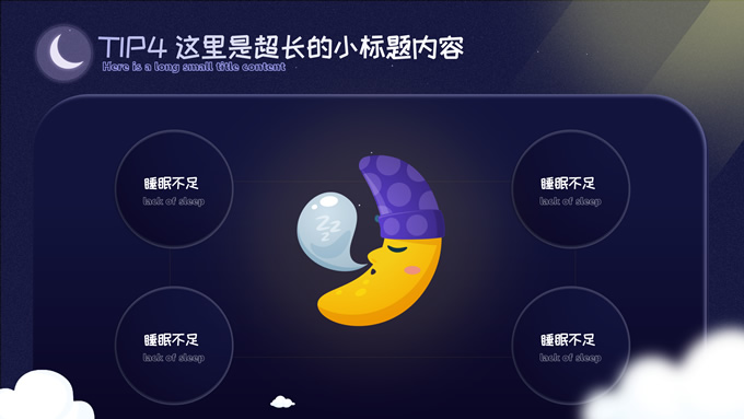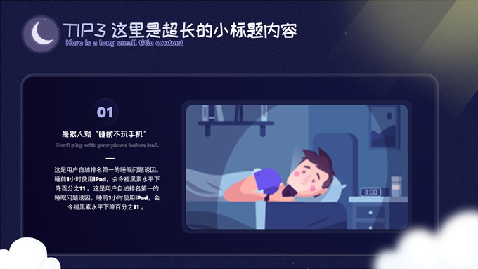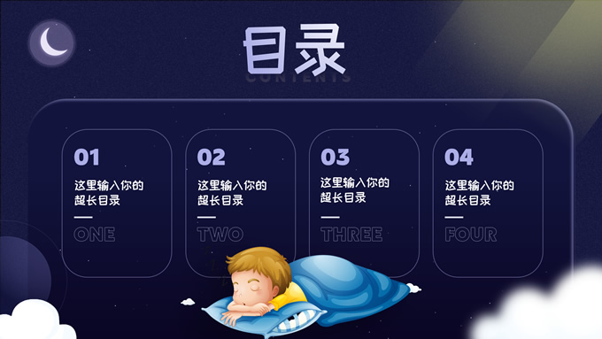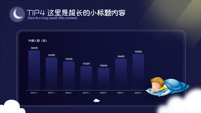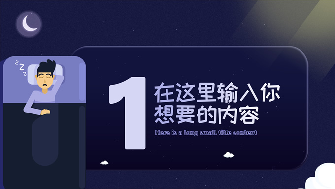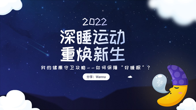 简介:可爱卡通风健康睡眠主题ppt模板,本模板共10P,这份可爱风类型的PPT,适合于与儿童,婴儿相关行业,整体采用夜间蓝和温馨黄来传达出温暖的感受,模板中内容100%可以编辑,本套PPT涵盖有封面页,目录页,过渡页,正文页等多种PPT版式页面,能满足绝大部分的与PPT设计相关内容展示,P界达人 wanna 作品。