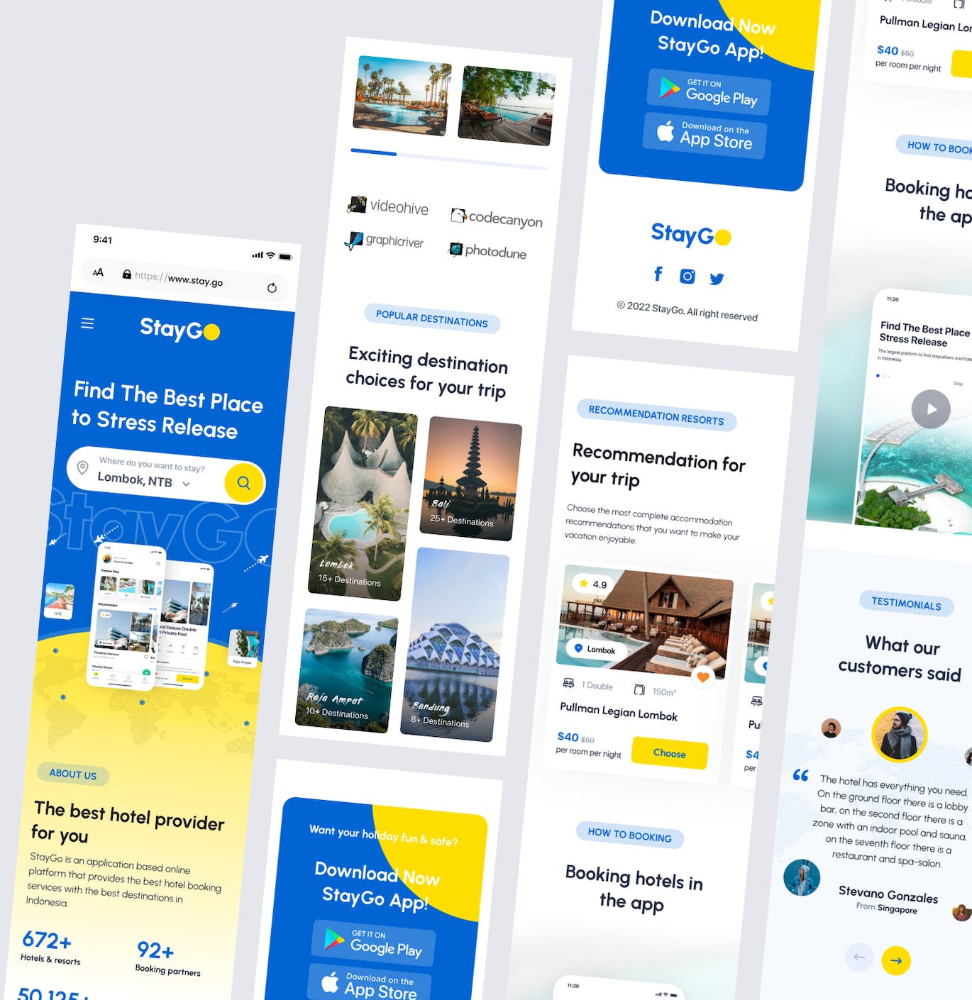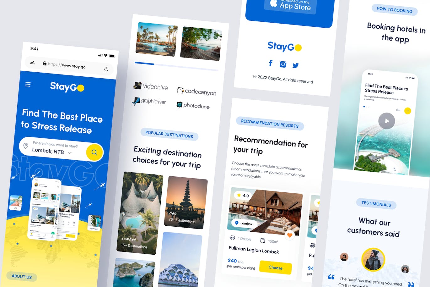 StayGo是酒店预订应用程序的响应性登录页面。用户可以按国家搜索任何假期。该系统将显示度假套餐、住宿酒店和住宿情况。此文件包括一个登录页。这是一个专业而现代的模板。文档齐全,易于定制。在Figma文件中提供。