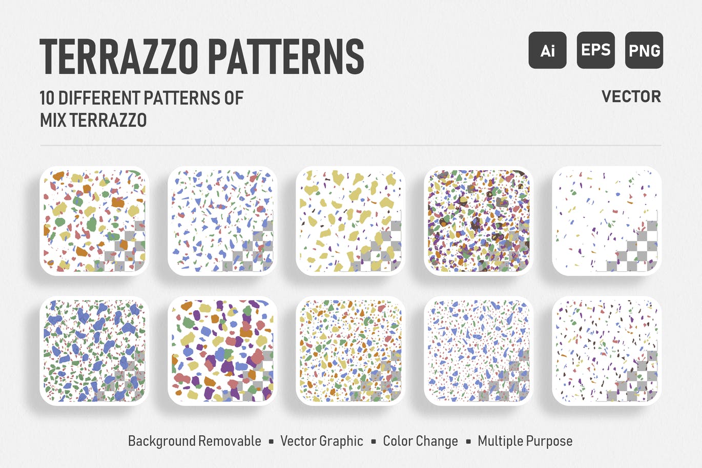 混合颜色水磨石无缝图案背景素材,水磨石样式图案目前非常流行,因此我们跳入水磨石潮流,并创建了这组10个无缝的、可定制的矢量水磨石图案。该系列包括趋势色,从泥土色到现代中性色。水磨石背景图案以EPS,PNG的形式提供。水磨石可以是一种微妙但独特的方式,在物理和数字应用中实现您的视觉。此套装可用于品牌,包装设计,海报,服装,文具或仅用于背景。