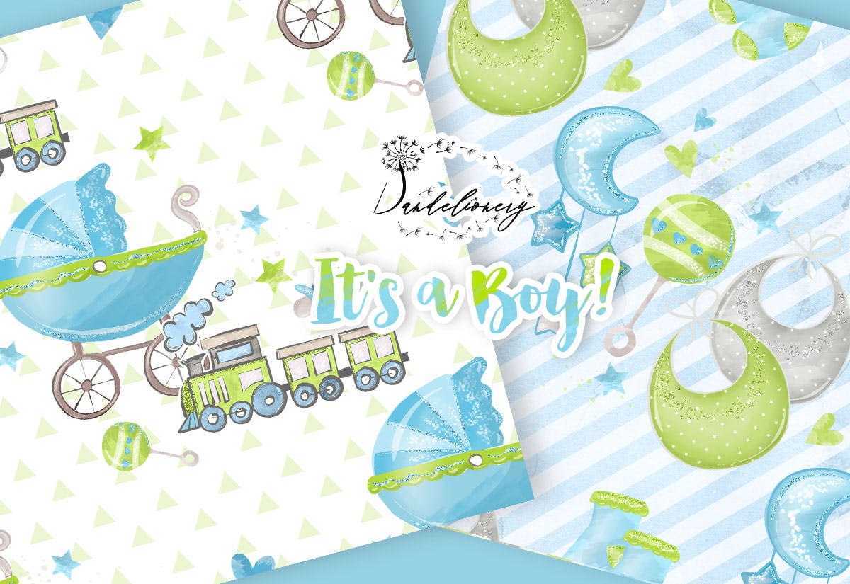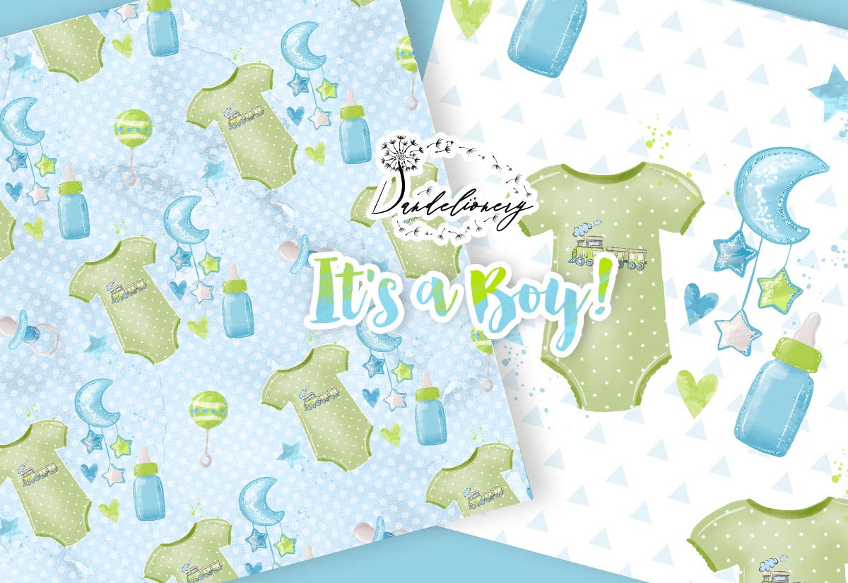蓝绿配色风格新生儿男孩水彩图案数码纸素材,托儿所、淡蓝色、心、星星、婴儿、男孩、新生儿、婴儿用品。