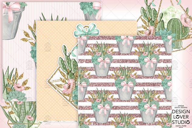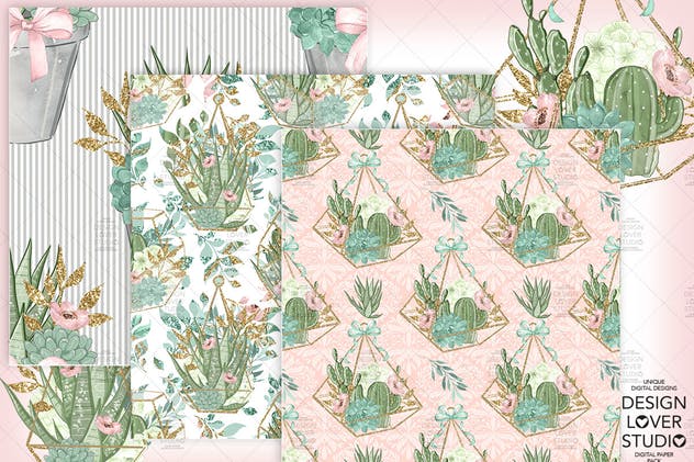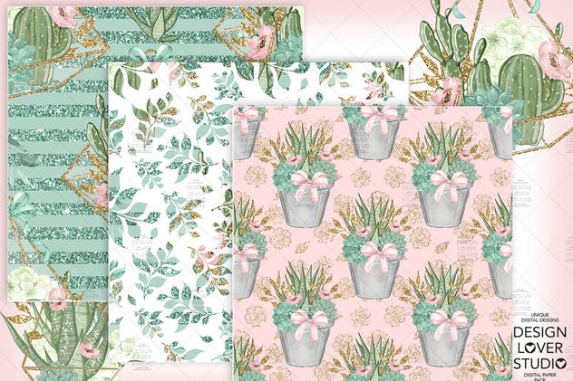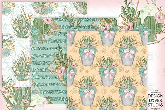 多肉植物主题水彩图案数码纸设计素材,春天水彩花、薄荷花卉图案、树叶剪贴画、无缝背景、玻璃容器、仙人掌。下载中包含15个植物背景图JPG文件, 6×6英寸。适用于个人和小型商业用途,非常适合婚礼请柬、卡片、剪贴簿、相册、印刷、礼品包装、独特的商店标签等。