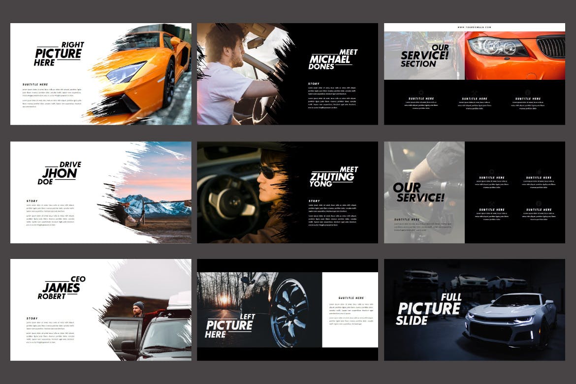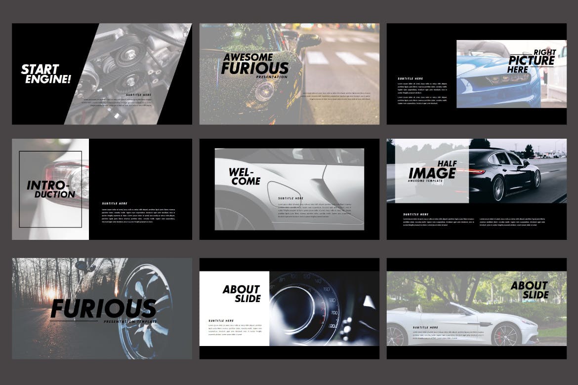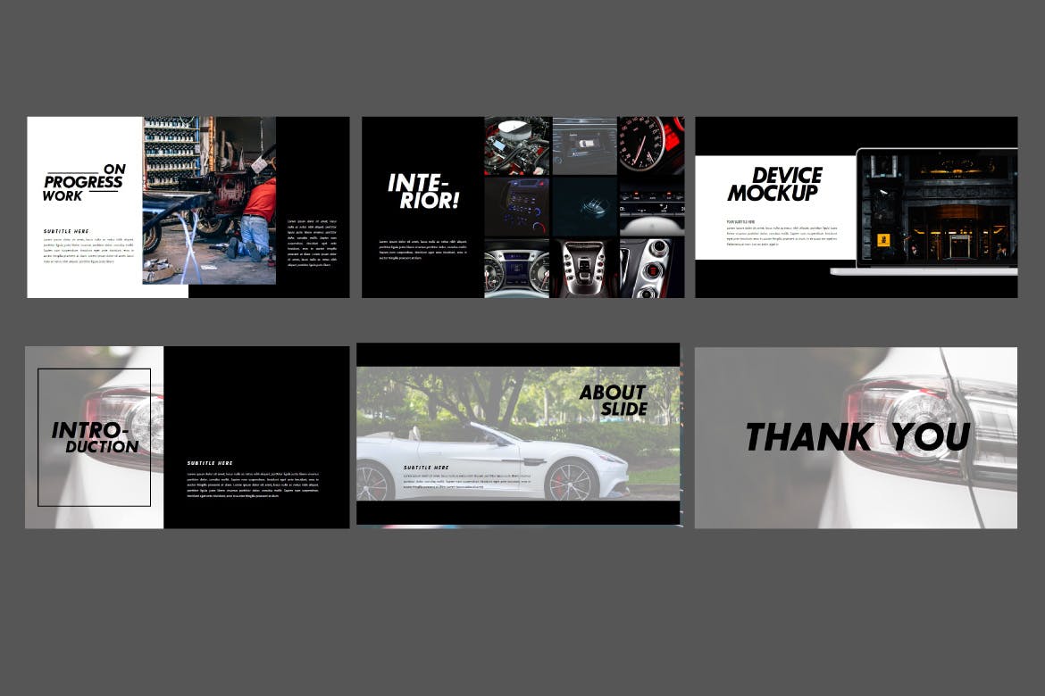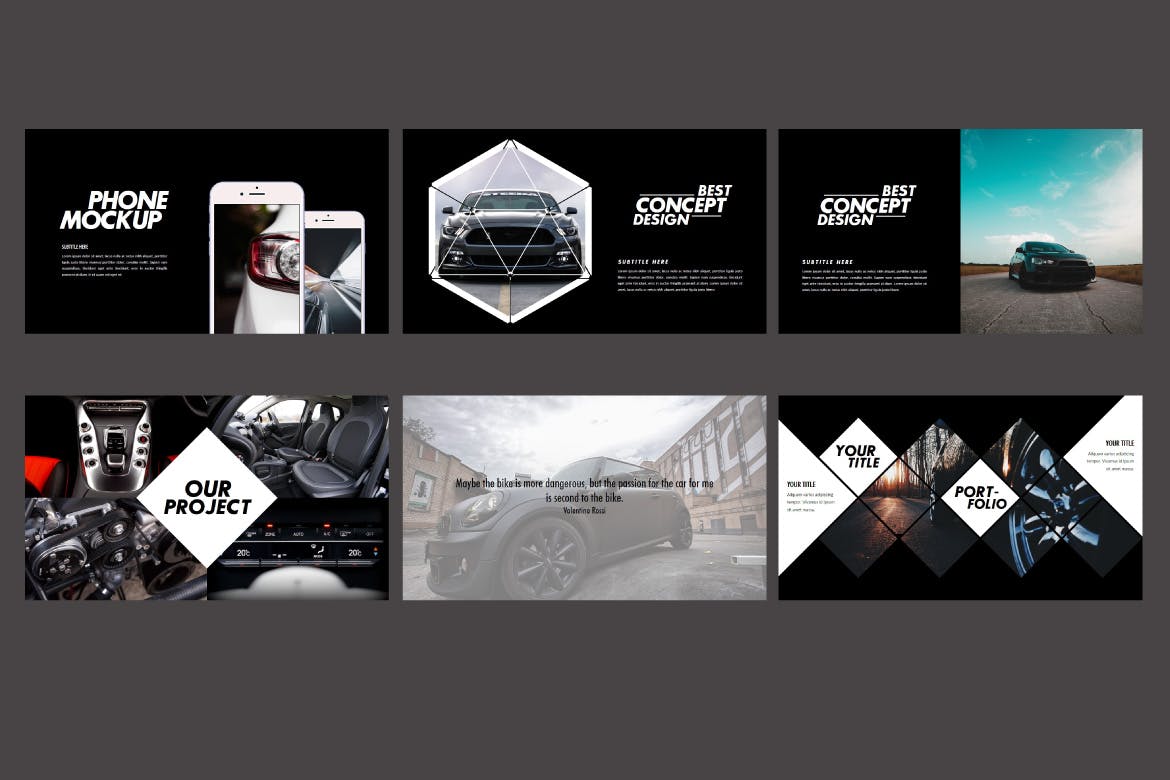 是有关跑车及其各种独特性的演示,非常适合用于各种公开演示,个人作品集,官方演示,创意代理,作品集设计师,插画作品集,摄影师作品集等。它就像根据您的需要进行自定义一样容易,可以替换图像和文本。